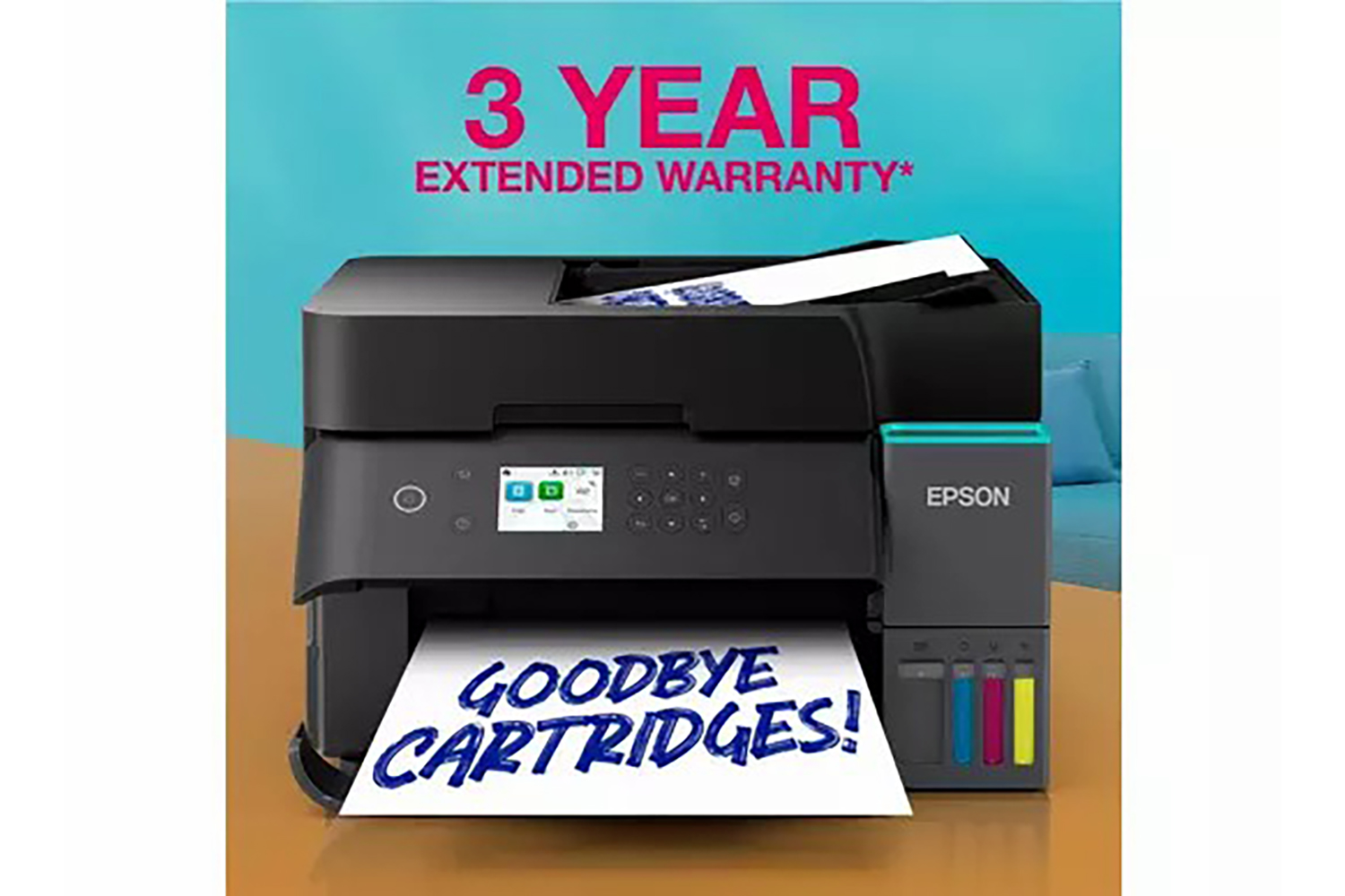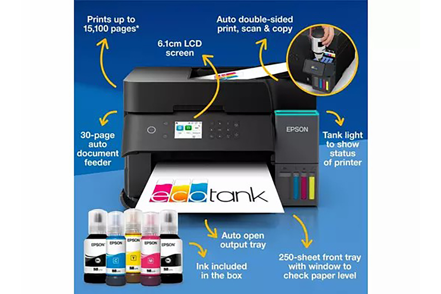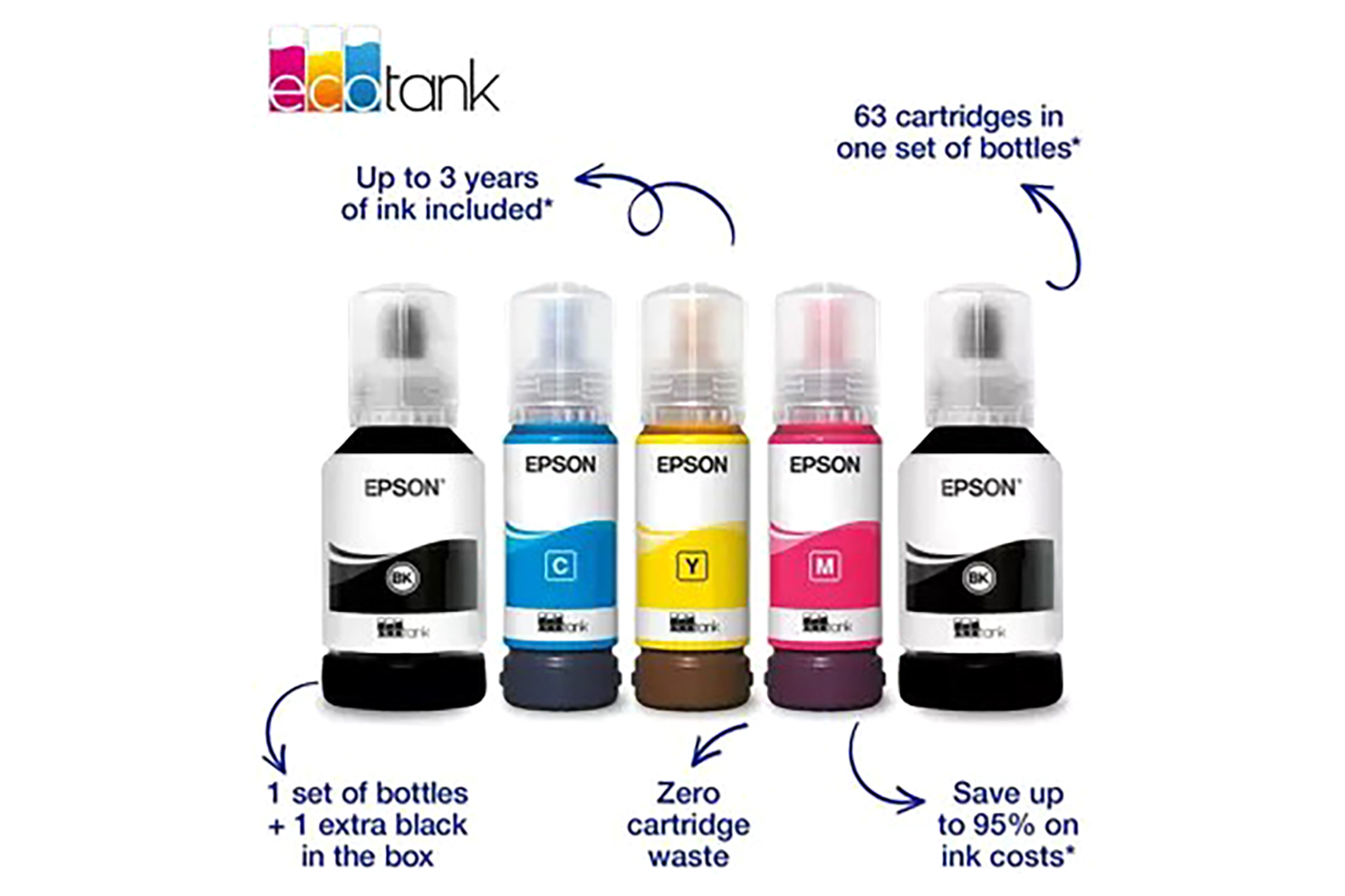 This economical printer saves you up to 95% on printing costs and comes with up to 3 years' worth of ink". The included ink bottles deliver up to 15,100 pages in black and white and 5,500 in colour, the equivalent of up to 63 cartridges worth of ink!"