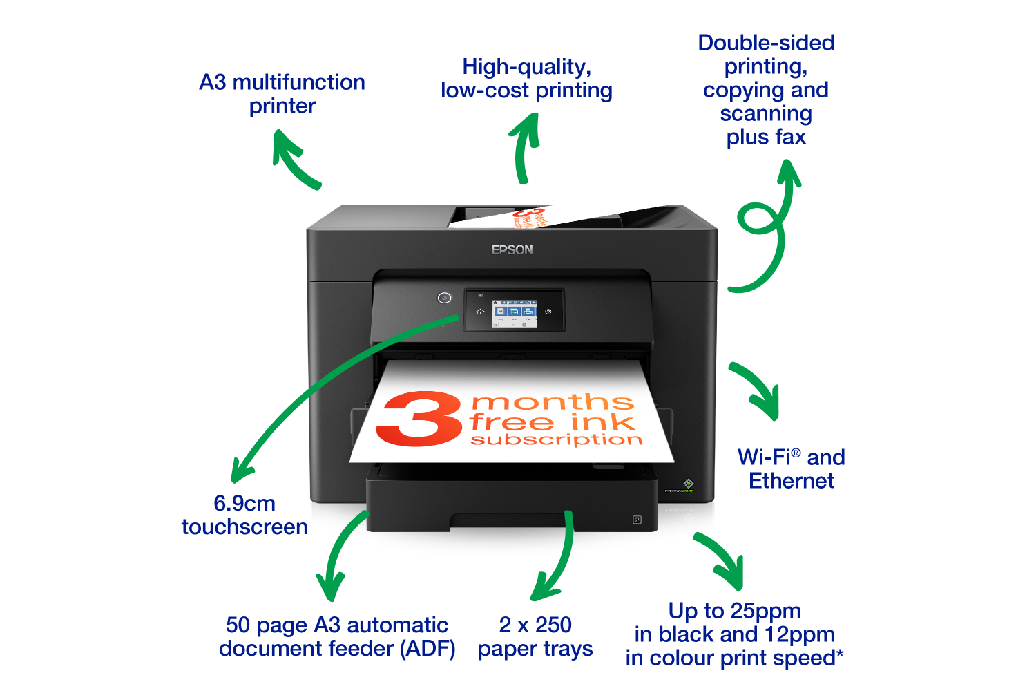 Think big with this high-quality multifunction with single and double-sided printing, scanning and fax all up to A3. You’ll stride through tasks with print speeds of up to 25ppm* in black and a 50 page A3 automatic document feeder (ADF). And that’s not forgetting its cost-effective inks and flexible wireless connectivity solutions such as Scan-to-cloud*.