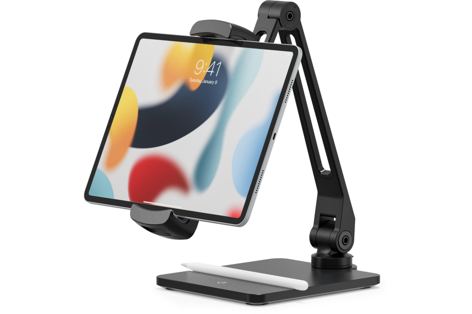 - Holds iPad or iPhone in infinite positions, heights and angles