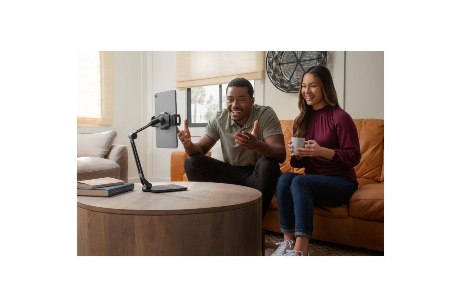 HoverBar Duo is a flexible arm that includes a weighted desktop base and adjustable shelf clamp. Use it like a multi-tool to get serious creative work done on an iPad. Use the sturdy shelf clamp in the kitchen to make a prototype video. Flip the stand’s New QuickSwitch Tab and snap the flexible HoverBar arm into the desktop base to finish your presentation.