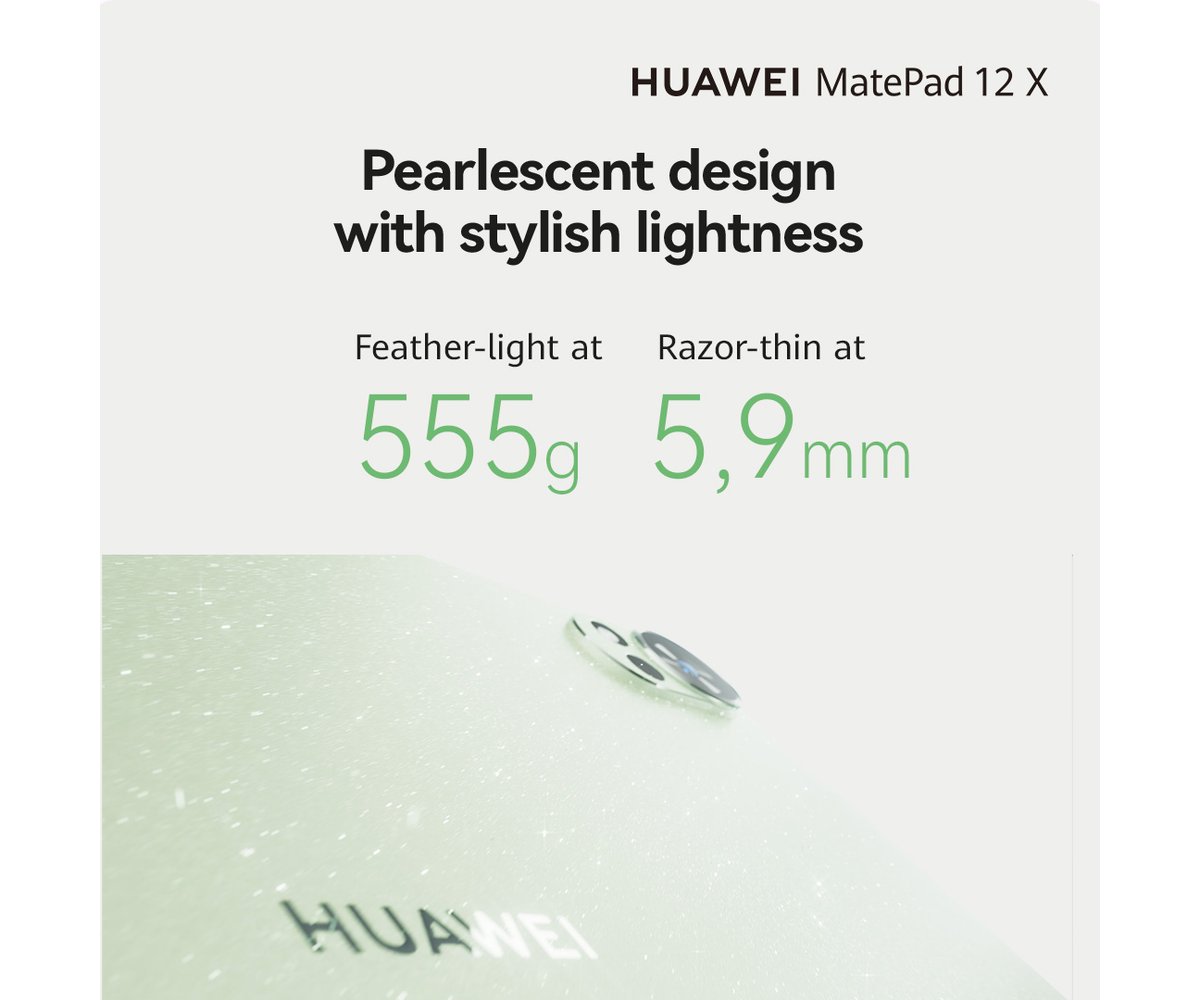 Weighing just 555 g and measuring only 5.9 mm thick, MatePad 12 X is built for life on the go. Its all-metal body features a seamless design with glossy gilded bezels and a shimmering pearlescent finish that changes with the light. Available in fresh, nature-inspired colours like Greenery and Sakura Pink, it’s as stylish as it is functional.