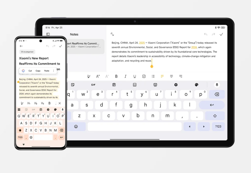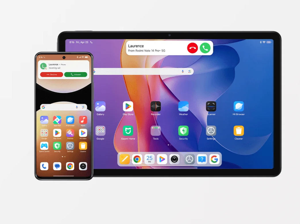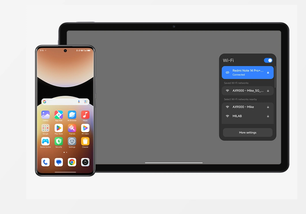 *Phones and tablets need to be upgraded to Xiaomi HyperOS 2 with Bluetooth and WLAN settings activated, log in to the same Xiaomi account, and make sure "Settings-Xiaomi Interconnectivity" is turned on. Availability of specific features, and services may vary depending on software version, apps and product model, please refer to the actual use.