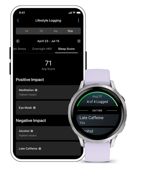 Log custom or preset behaviours — such as caffeine and alcohol intake — and view reports on how those lifestyle choices impact your sleep, stress, and HRV3 in the Garmin Connect app. That way, you can make more health-conscious decisions.