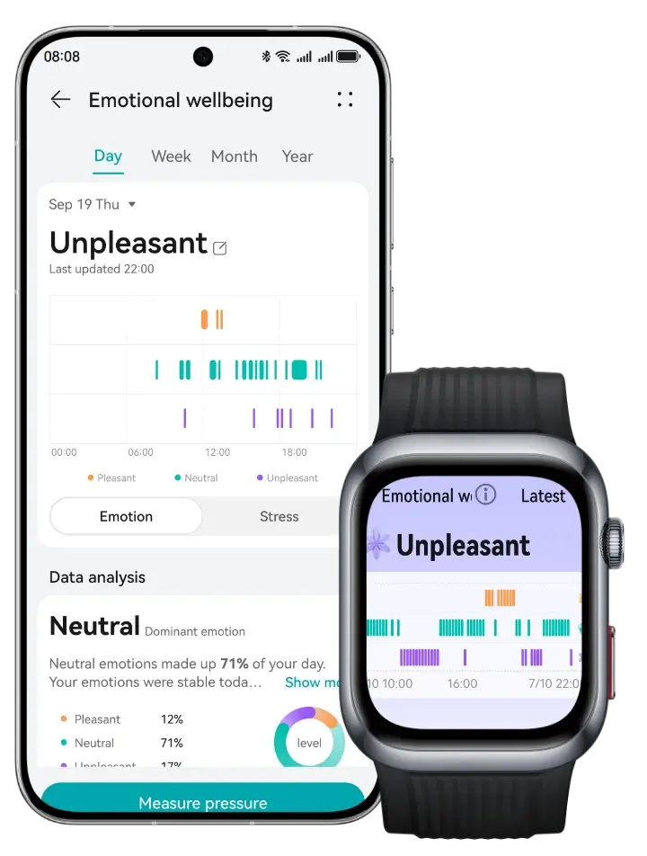 15.Emotion trend tracking data is available in the Huawei Health app. This feature is only available when connected to a 64-bit (but not 32-bit) Android phone or an iPhone that's installed with the latest version of Huawei Health.