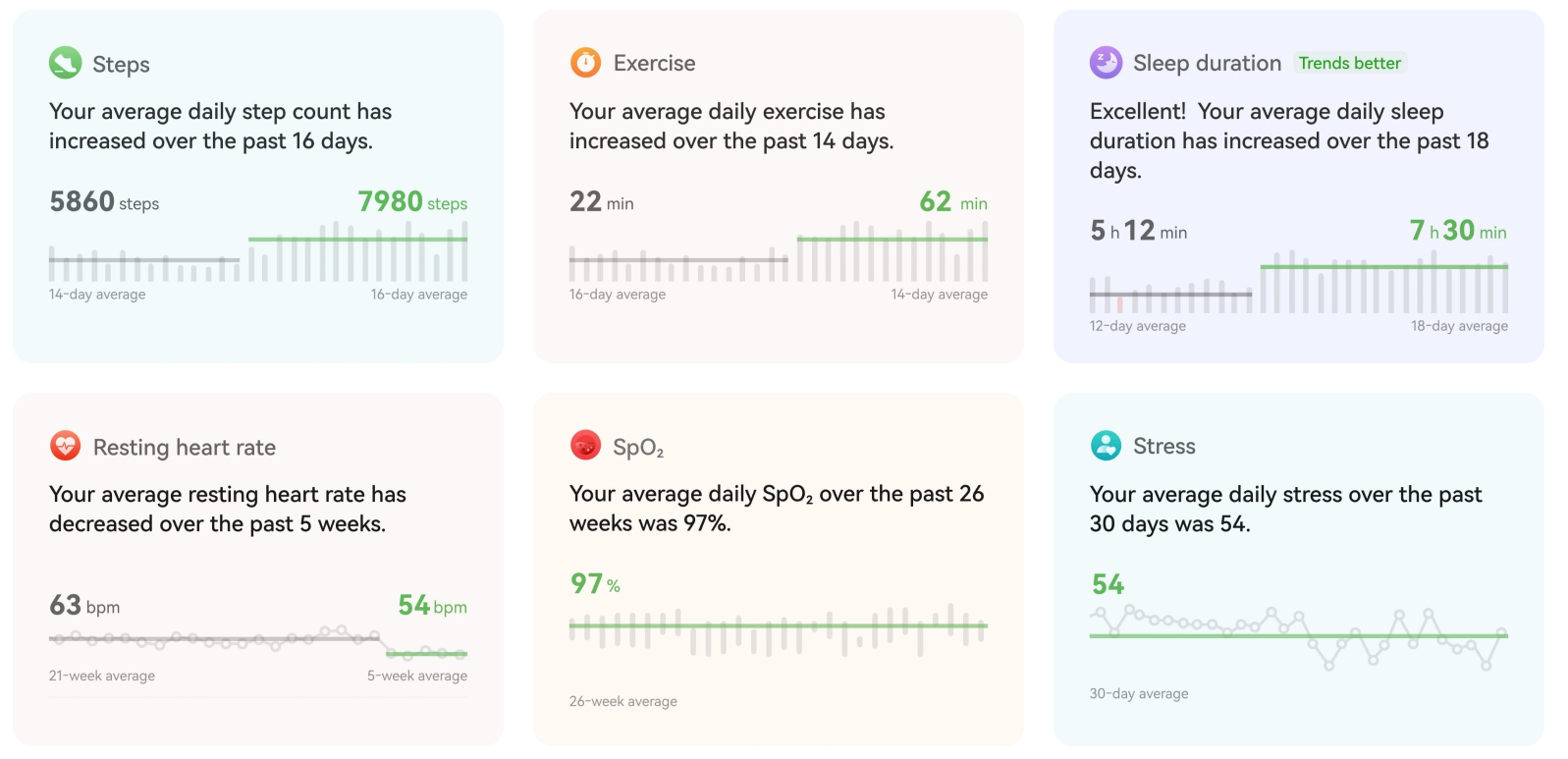 Get a handy Health Glance report in just a few moments, and browse up to 9 key indicators, with dynamic trends laid out for you in intuitive graphs and charts, to see what your body is telling you right away.