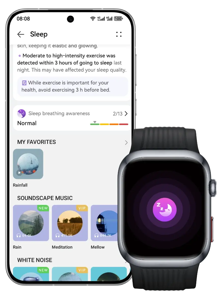 Clear your mind with a special Sleep mode, white noise, natural soundscapes, and relaxing music, to rest easy every night.[9]