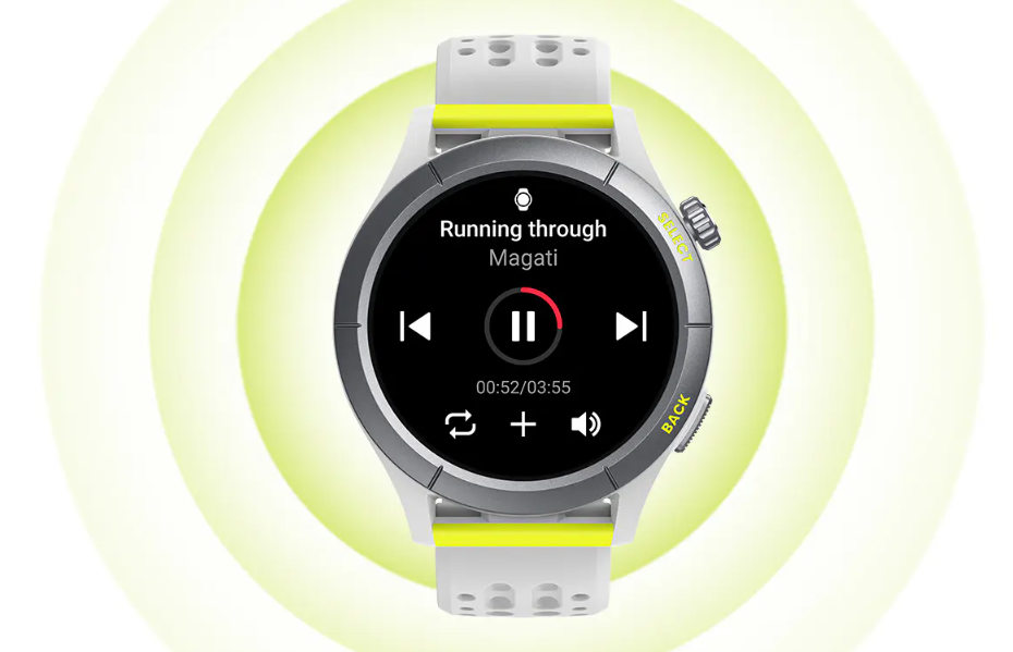 14. Live Sports Data Broadcast supports English and Chinese voice broadcasts, and requires a connection to Bluetooth headphones. 15. The maximum storage space for music is 2.3GB (due to the system space occupied, the actual space used by the user may be less than 2.3GB); based on 5-10MB per song, it can store up to 270-470 MP3 songs. The watch has no built-in speaker, so connect via Bluetooth to your TWS earbuds to listen to music.
