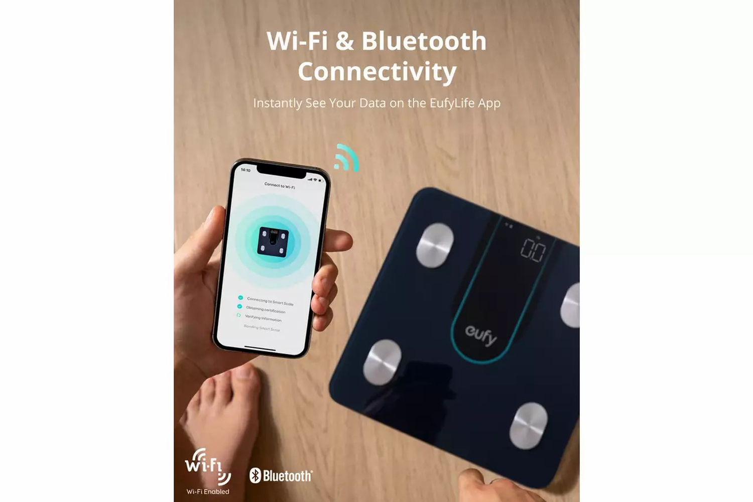 Even if you don't have your phone, your data will automatically upload to EufyLife via Wi-Fi. Bluetooth sync is also available if you don't have Wi-Fi.