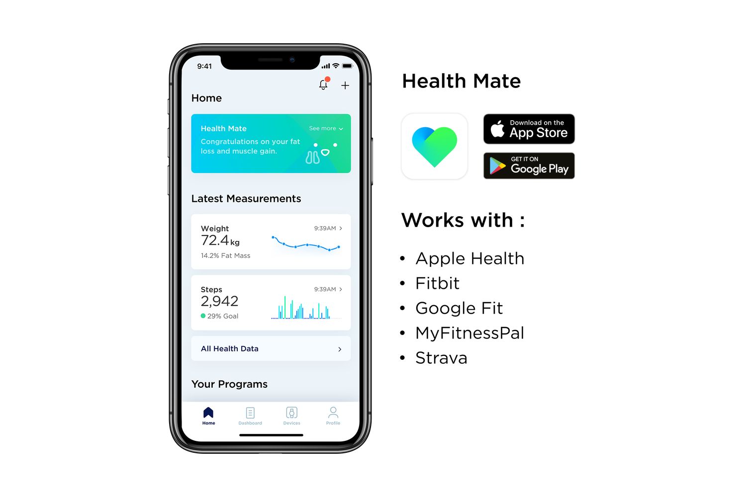 Specially designed to be multi-user friendly, these body scales can recognise up to eight separate users, keeping each individual's data sorted independently and synced specifically to the individual’s Health Mate profiles. To ensure optimal seamless weight management, all scale data also automatically syncs to the companion Health Mate App via Wi-Fi and Bluetooth, amalgamating over 100 other supporting health and fitness apps to guide you towards your desired goals.
