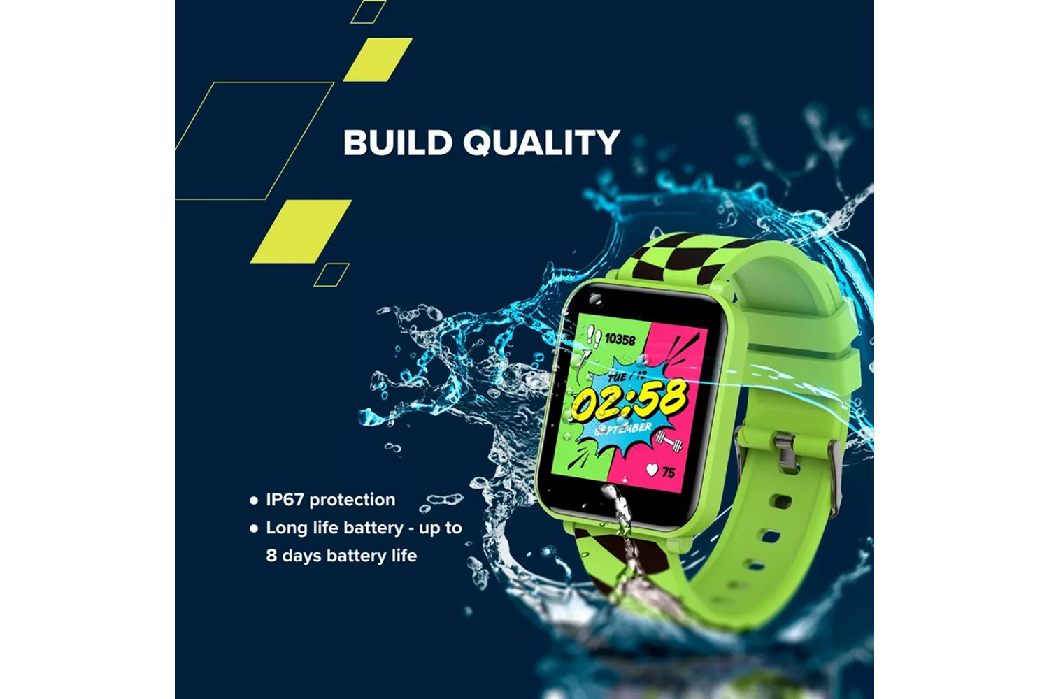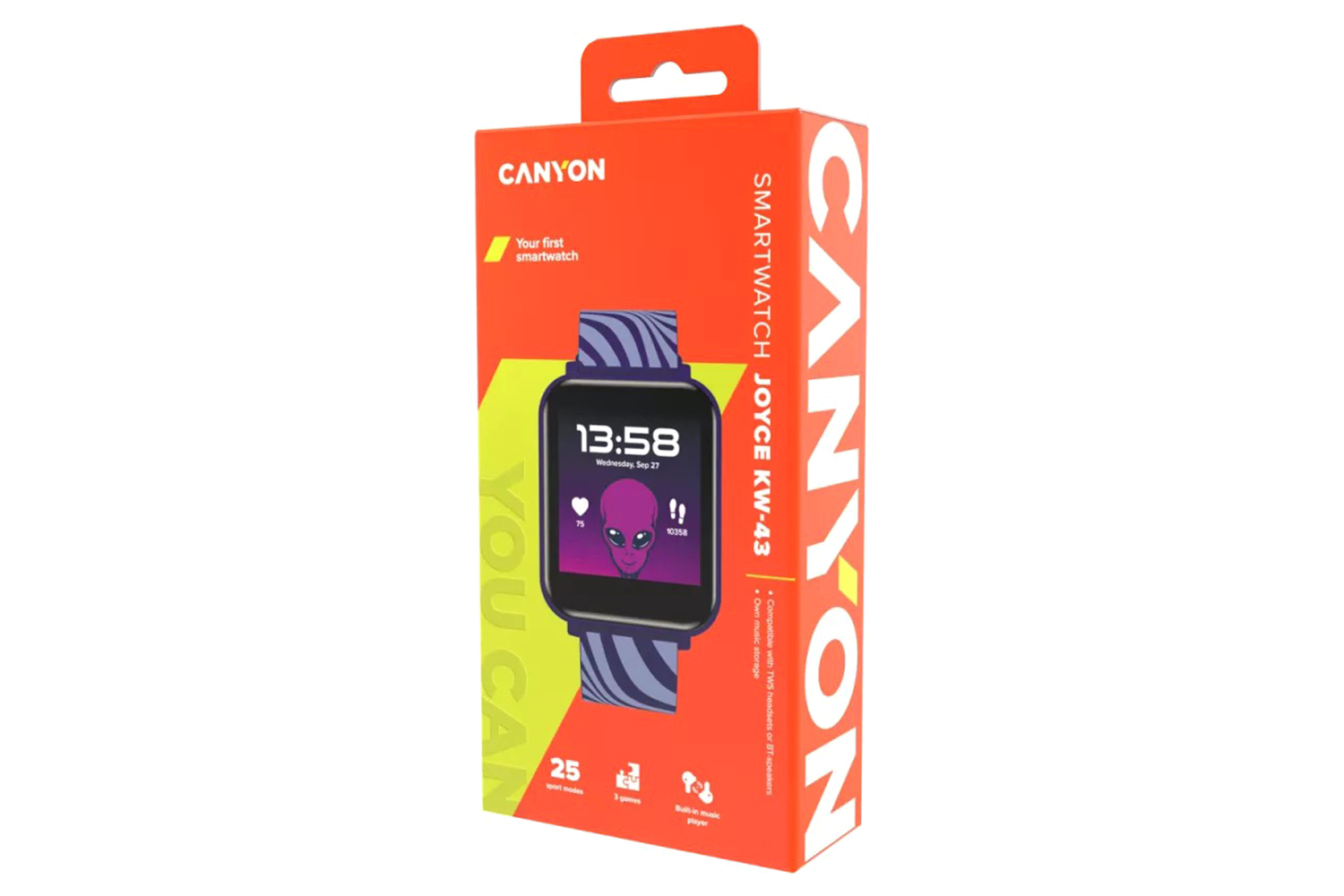 This flashy smartwatch is quite remarkable — it will definitely make itself heard. KW-43 Joyce was crafted especially for teens, and it boasts a nifty user interface that’s as easy to use as a spoon. You can change watch faces by choosing from built-in options, the app's library, or by creating your own custom watch face. With notifications for calls and messages, you can always stay connected. The dual Bluetooth feature allows connection to TWS/Bluetooth headphones or a Bluetooth speaker for your kid’s musical cravings. Speaking of tunes, the KW-43 Joyce has 512MB of storage and a built-in speaker so they can groove to their favorite beats on the fly. And with the camera and music remote control, they can snap pictures and switch tracks without even pulling out their phone. That’s not all: KW-43 also comes with three pre-installed games to keep its owner entertained. And with active health monitoring for heart rate, calories, and steps, this smartwatch encourages a healthy lifestyle. For the sporty teens out there, Joyce boasts 25 sports modes to choose from. Whether they’re into basketball, soccer, or swimming, this smartwatch can track their progress and help them hone their skills. With up to 8 days* of battery life and IP67 waterproof rating, this smartwatch is tougher than most devices of its class. Keep the worries away! If your teen is active and loves gadgets, KW-43 is the device you should get!.
