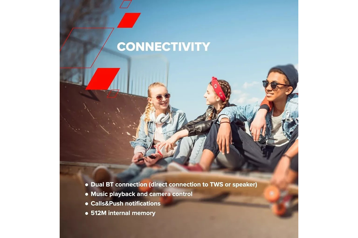 Your teen can easily track calls & push notifications with a glance on their wrist. The dual BT function allows simultaneous connection to the headphones or speaker. Music playback and the smartphone’s camera can be controlled right from the watch.