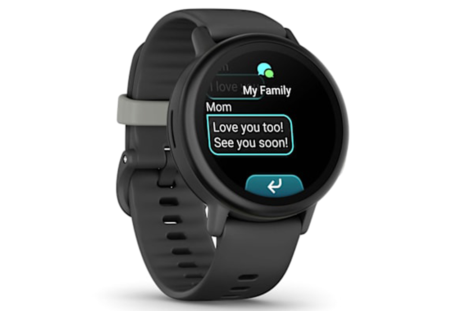 With an active subscription, you can use the Garmin Jr. app to send text messages to your child’s Bounce 2 smartwatch. Kids can create their own messages and respond with a full on-device keyboard, including emojis or sound emojis, to parent-approved contacts and in family group messages.