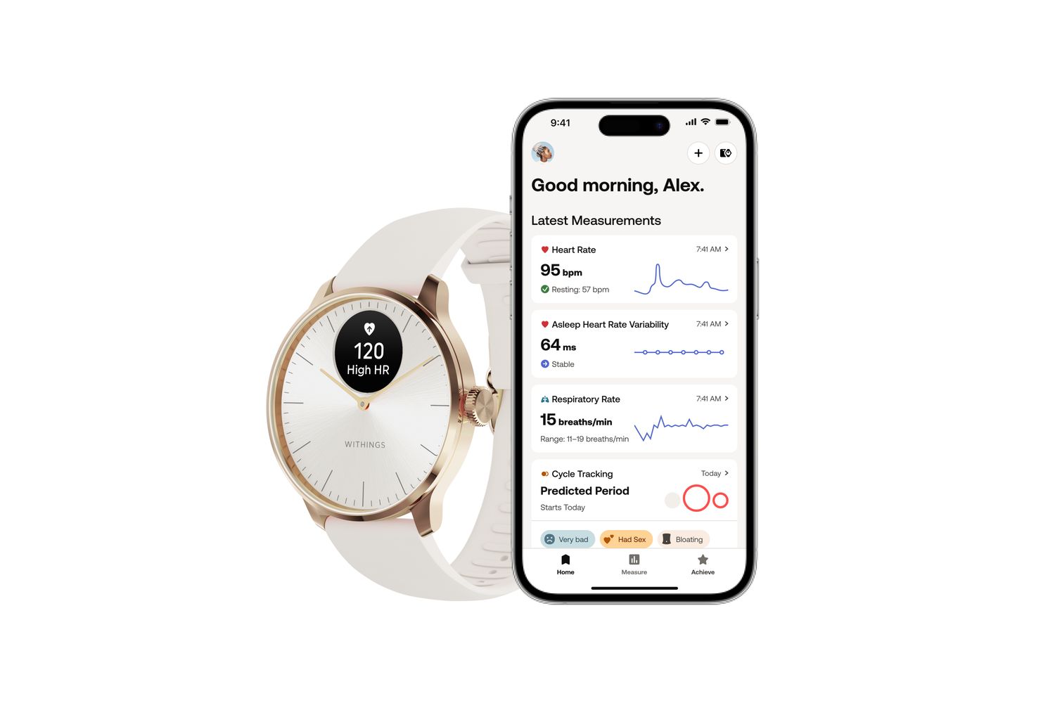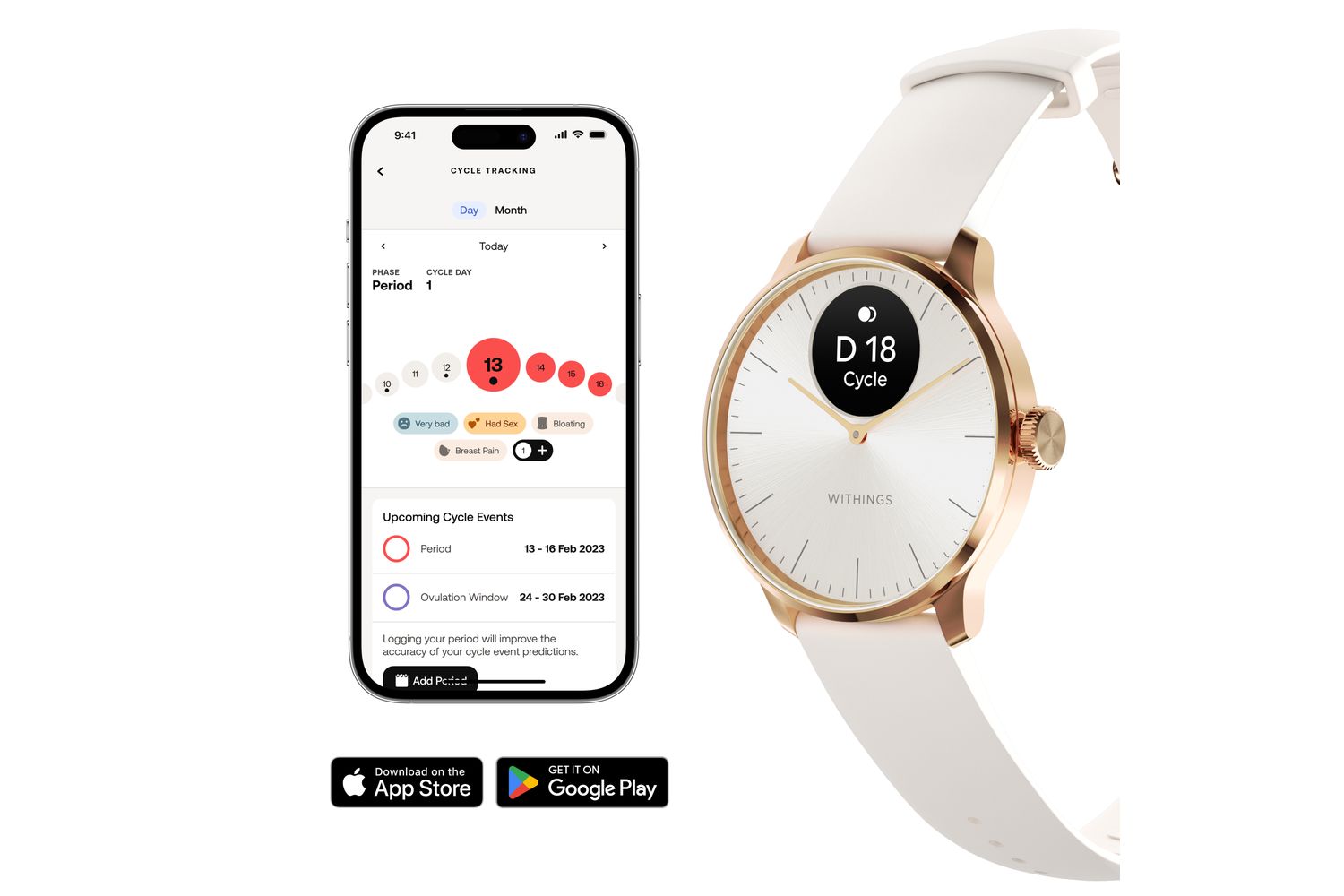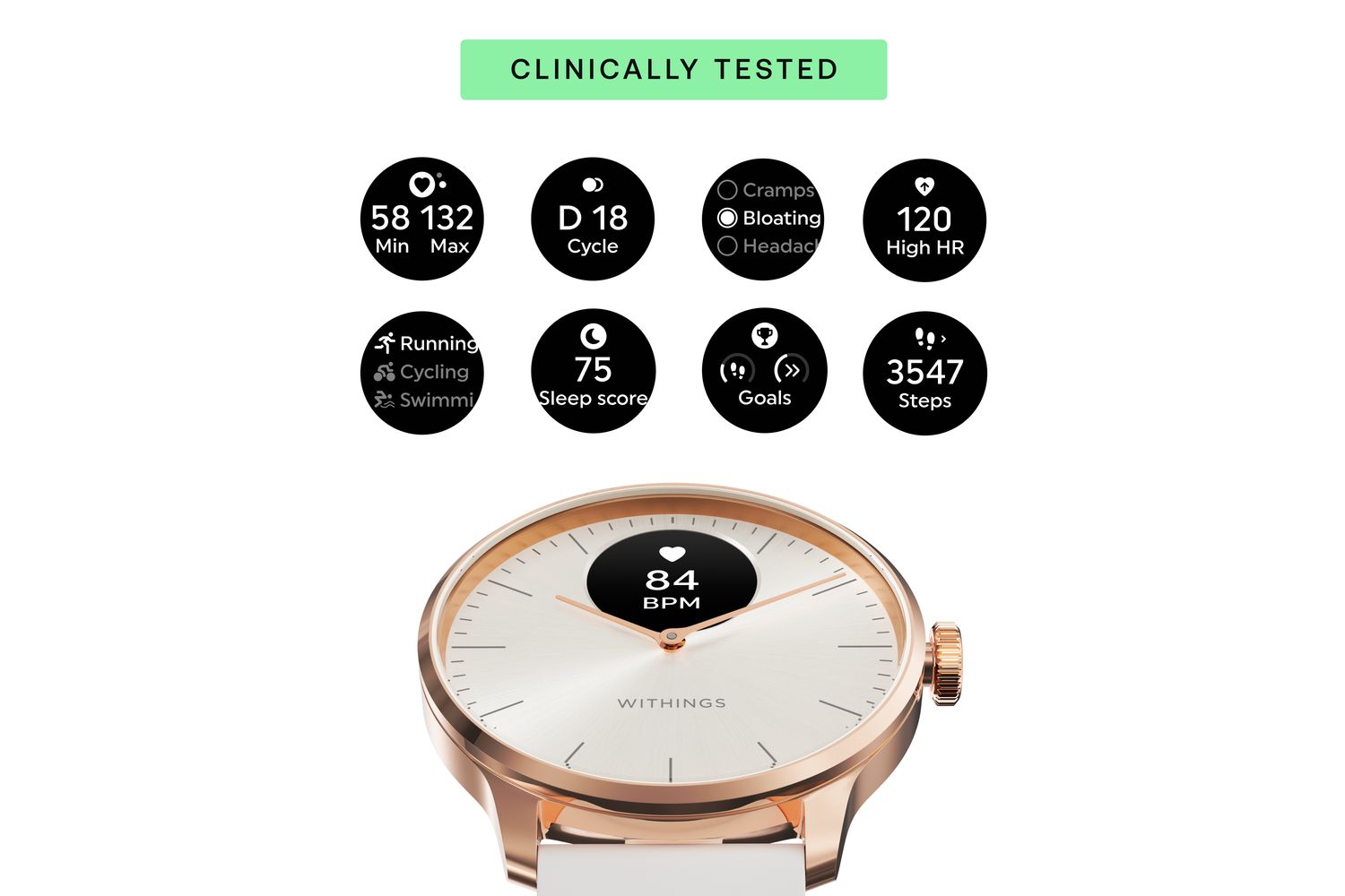 It’s not just about tracking physical activities; the ScanWatch also taps into women's unique health needs by providing an empowering menstrual cycle guide. By letting you log symptoms, phases and duration and view them alongside other measurements like heart rate or sleep quality, the ScanWatch helps you optimize your routine and build better cardiovascular health.