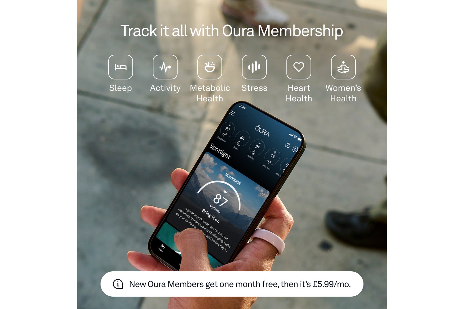 From a workout to a night out, Oura Ring 4 Ceramic is comfortable for 24/7 wear. The titanium interior is gentle to the touch, even on sensitive skin. With no screens and no vibrations, you’re free to forget it’s on. Until you start getting compliments.