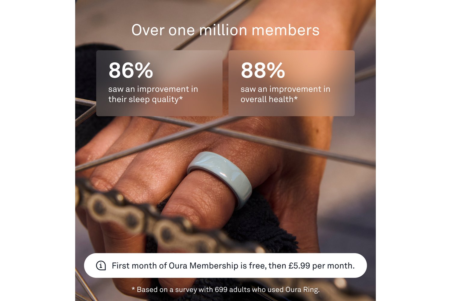 From a workout to a night out, Oura Ring 4 Ceramic is comfortable for 24/7 wear. The titanium interior is gentle to the touch, even on sensitive skin. With no screens and no vibrations, you’re free to forget it’s on. Until you start getting compliments.