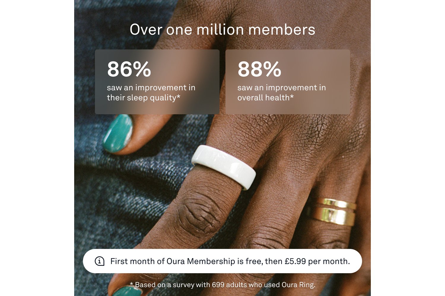 From a workout to a night out, Oura Ring 4 Ceramic is comfortable for 24/7 wear. The titanium interior is gentle to the touch, even on sensitive skin. With no screens and no vibrations, you’re free to forget it’s on. Until you start getting compliments.