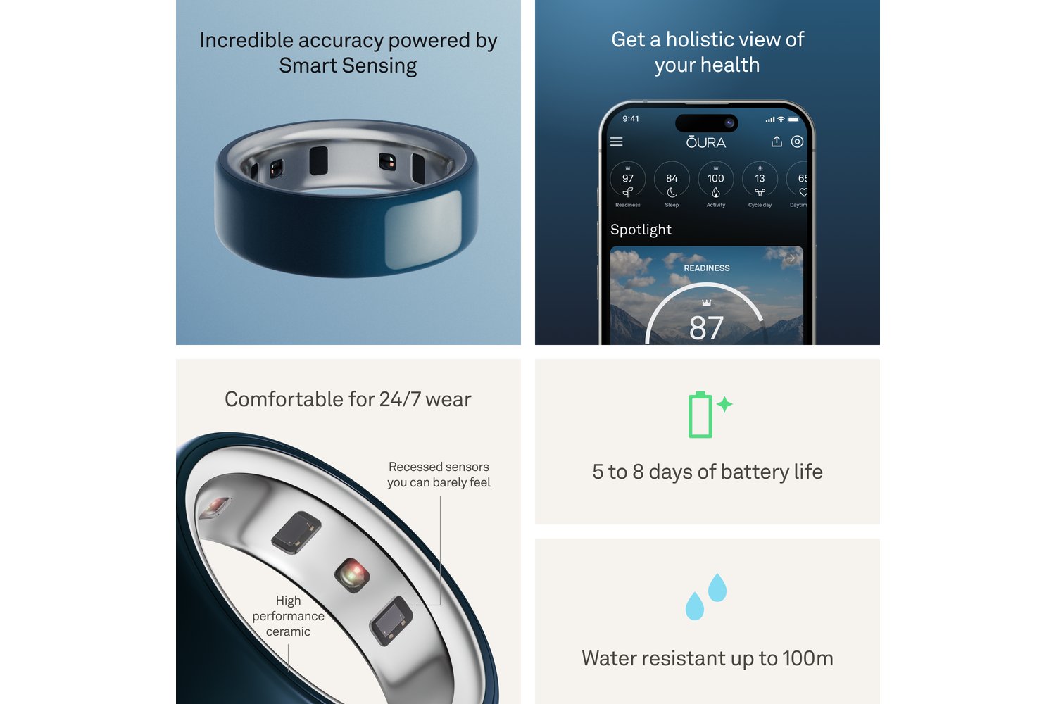 Oura Ring 4 Ceramic is powered by Smart Sensing, a breakthrough innovation that adapts to each member’s unique finger to deliver accurate, continuous data, day and night – all while optimizing the battery life.