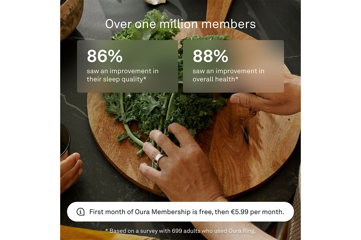 First month of Oura membership is on us for new members with your purchase, €5.99/mo afterwards (or €69.99 annually). Enjoy access to continuous feature and app updates within the award-winning Oura App.