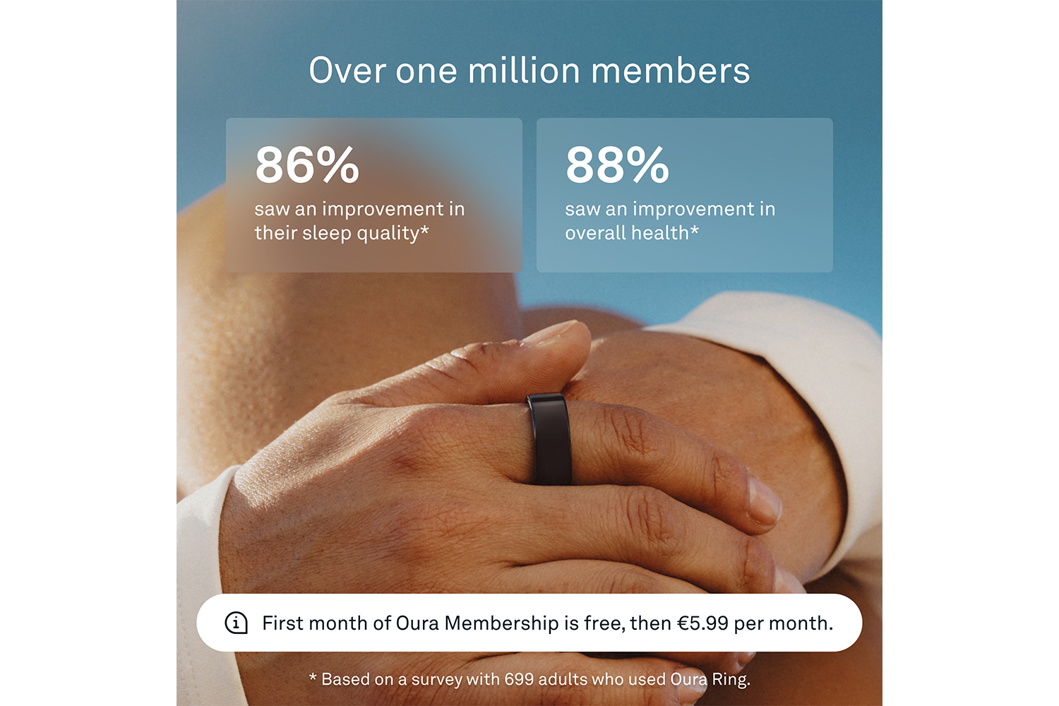 First month of Oura membership is on us for new members with your purchase, €5.99/mo afterwards (or €69.99 annually). Enjoy access to continuous feature and app updates within the award-winning Oura App.