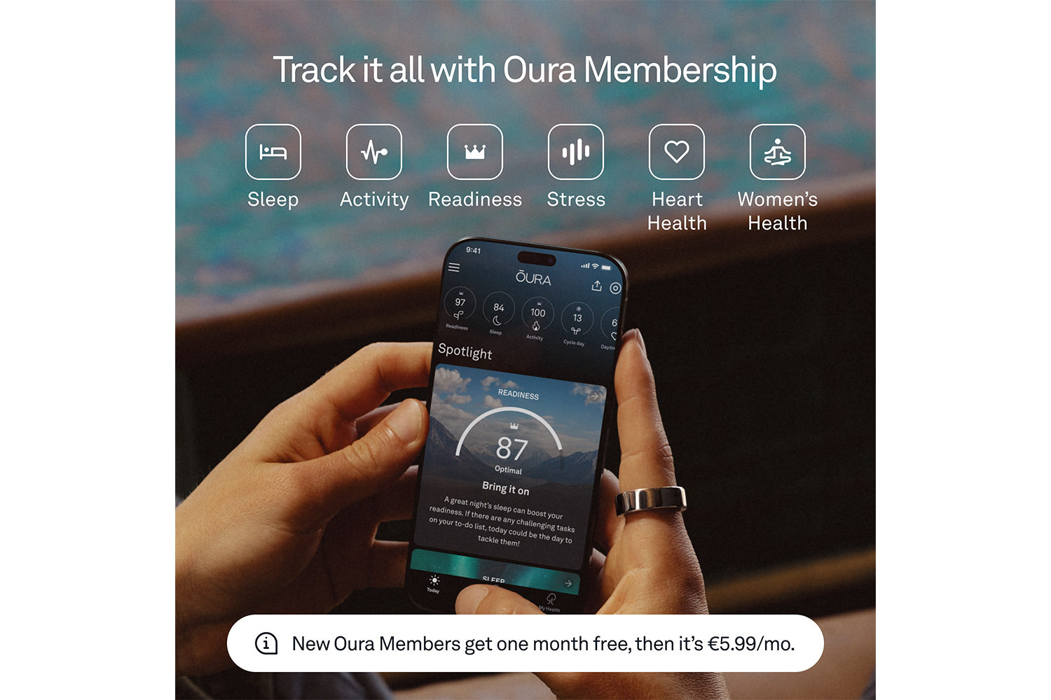 First month of Oura membership is free with your purchase, €5.99/mo afterwards. Offer available to new members only. Or opt for the annual prepaid option for €69.99. Membership is tied to your account via the Oura app, not your physical ring.