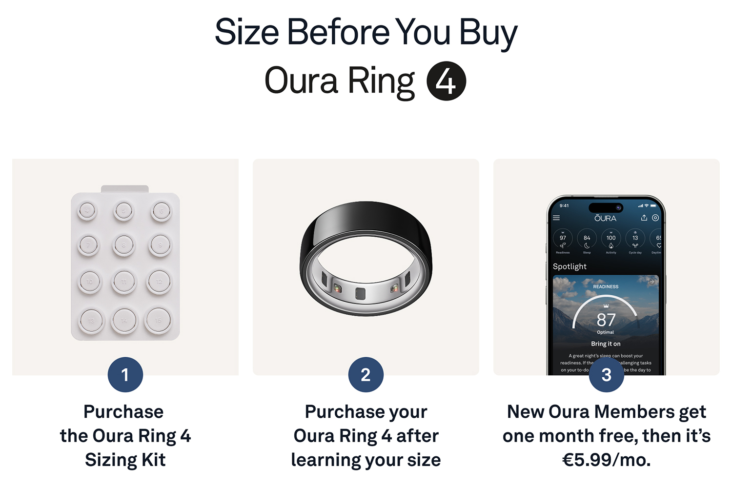 Size yourself with the Oura Ring 4 sizing kit before purchasing your Oura Ring 4.