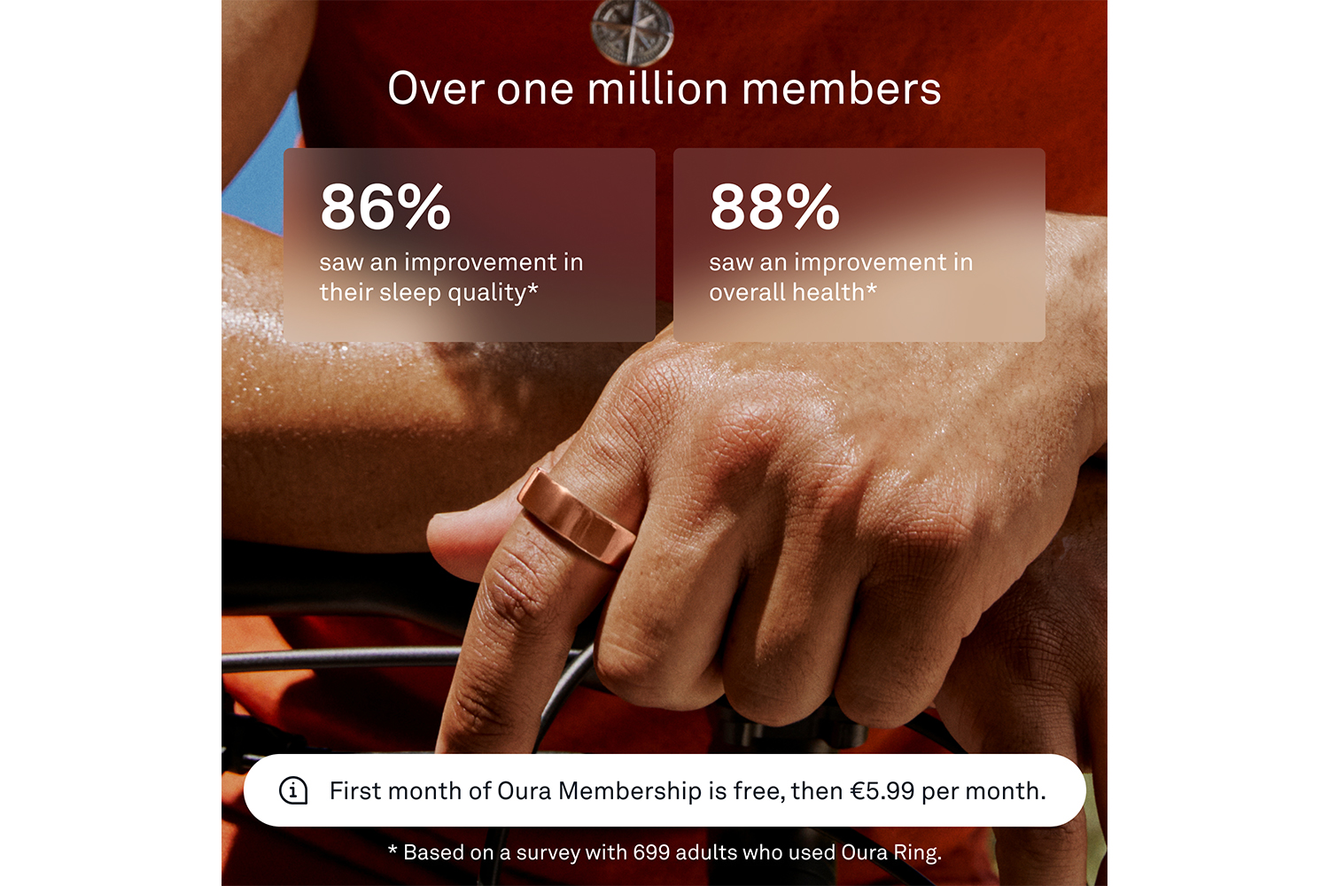First month of Oura membership is on us for new members with your purchase, €5.99/mo afterwards (or €69.99 annually). Enjoy access to continuous feature and app updates within the award-winning Oura App.