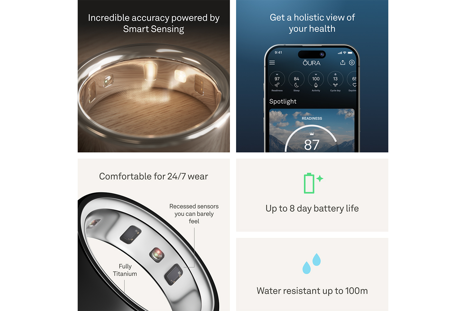 The updated design of the Oura Ring 4 is more comfortable, Fits better than ever, and is water resistant. The first all-titanium smart ring combines exceptional durability with a gentle touch, even for sensitive skin.