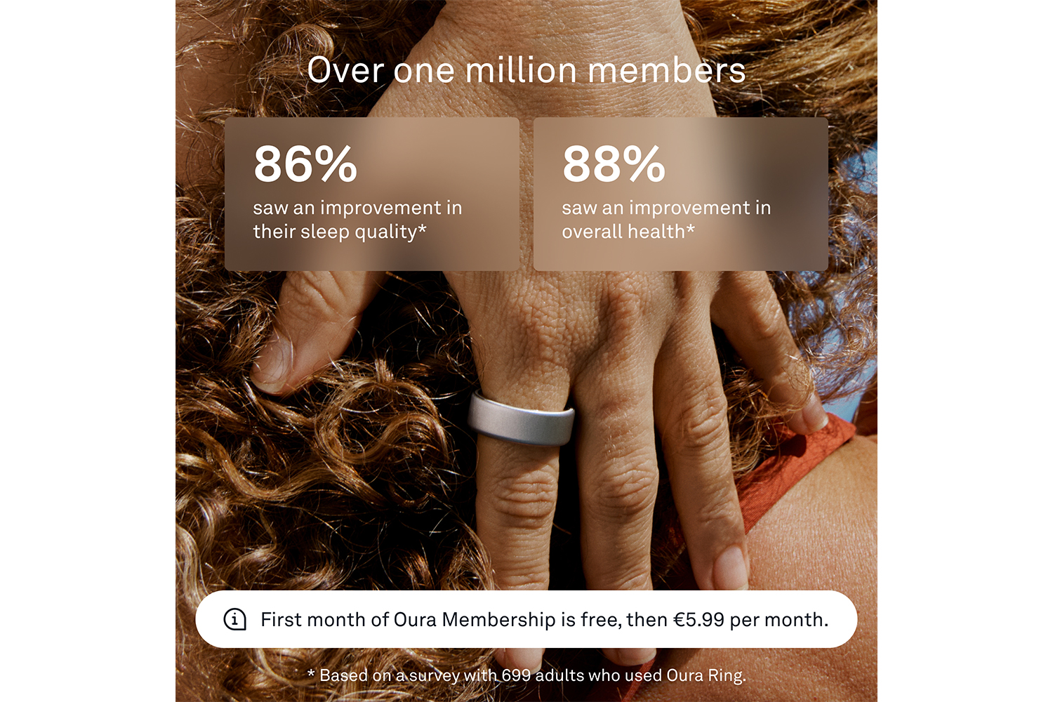 First month of Oura membership is on us for new members with your purchase, €5.99/mo afterwards (or €69.99 annually). Enjoy access to continuous feature and app updates within the award-winning Oura App.