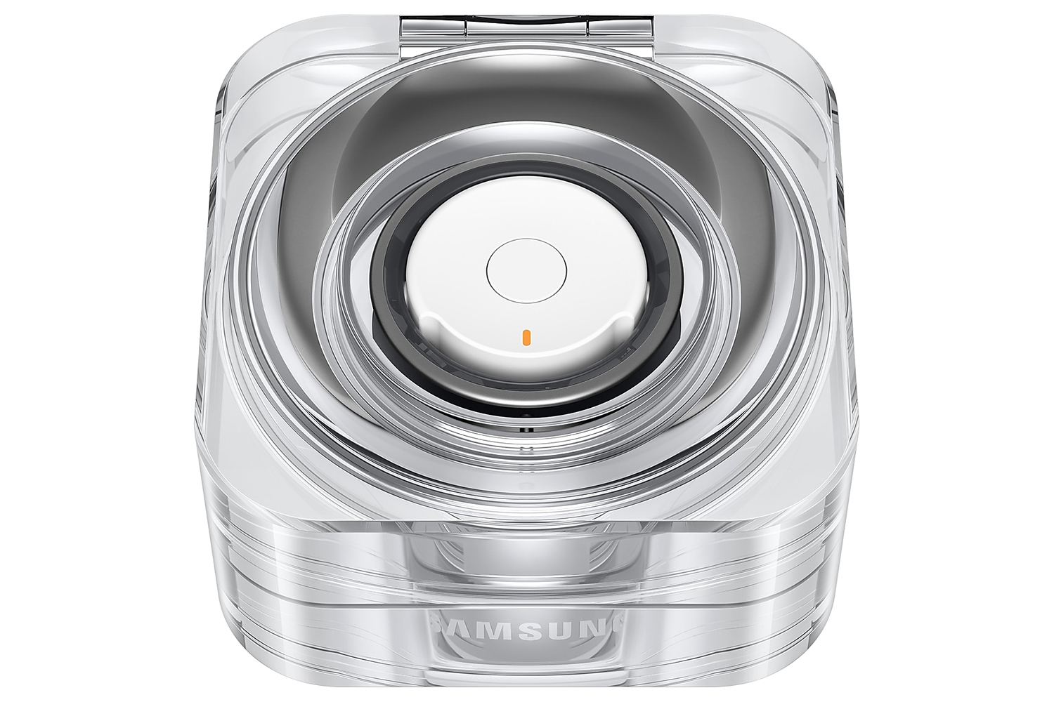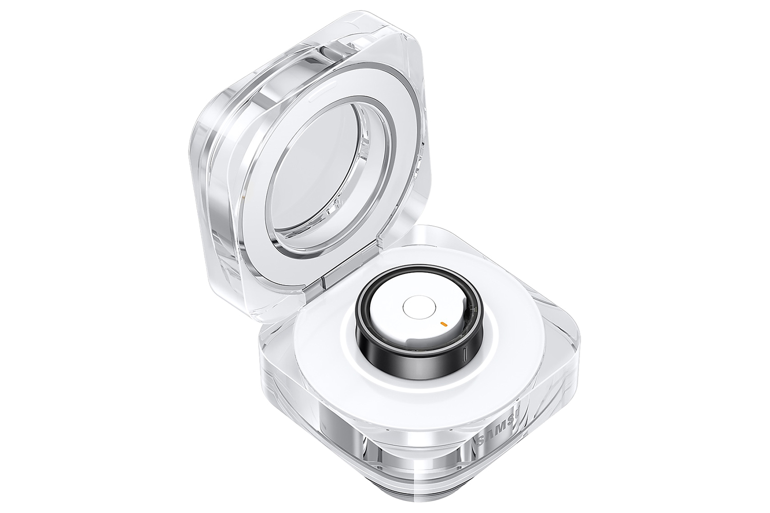 Even while charging in its crystal-clear Charging Case, the Galaxy Ring is a sight to behold. The delicate glow of the light around the Multi-purpose button indicates the battery charging level. The Charging Case can be charged wirelessly too, so simply place your Galaxy Ring securely in its case when you're on the go, and place it on a wireless charging pad for easy charging. [14], [15], [16]