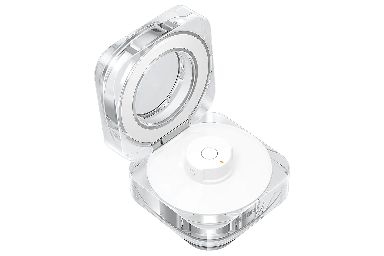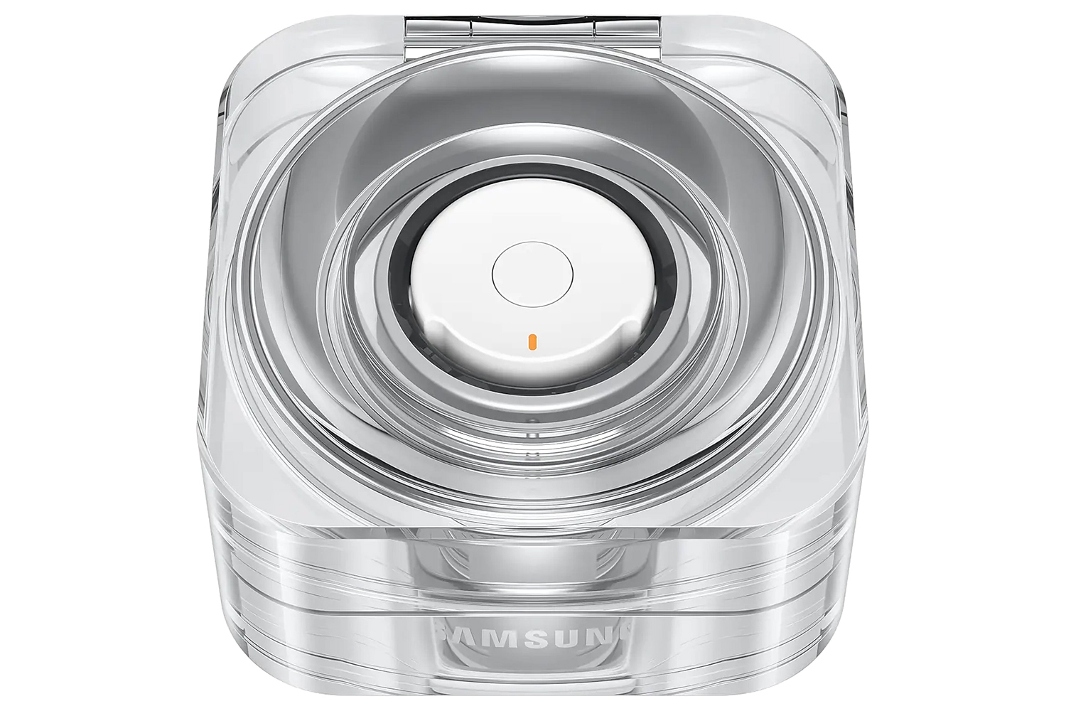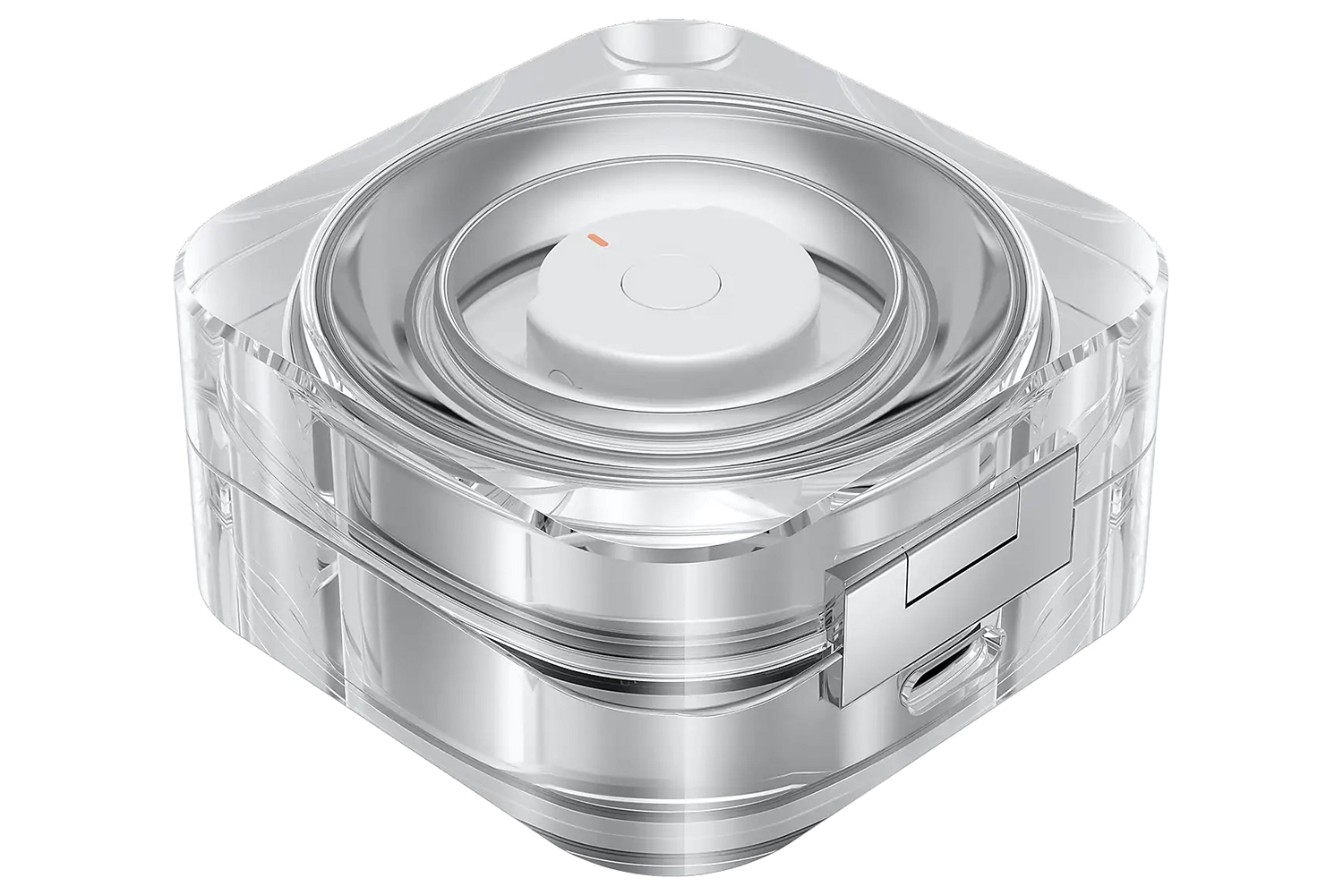 Even while charging in its crystal-clear Charging Case, the Galaxy Ring is a sight to behold. The delicate glow of the light around the Multi-purpose button indicates the battery charging level. The Charging Case can be charged wirelessly too, so simply place your Galaxy Ring securely in its case when you're on the go, and place it on a wireless charging pad for easy charging. [14], [15], [16]