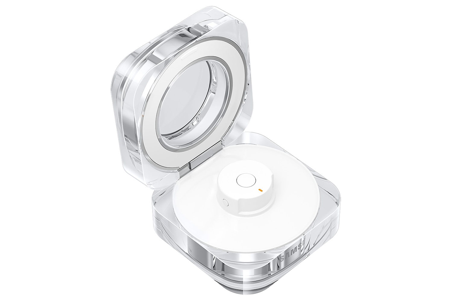 Even while charging in its crystal-clear Charging Case, the Galaxy Ring is a sight to behold. The delicate glow of the light around the Multi-purpose button indicates the battery charging level. The Charging Case can be charged wirelessly too, so simply place your Galaxy Ring securely in its case when you're on the go, and place it on a wireless charging pad for easy charging. [14], [15], [16]