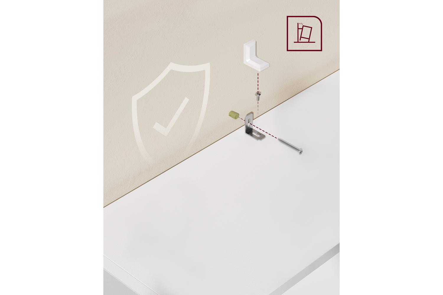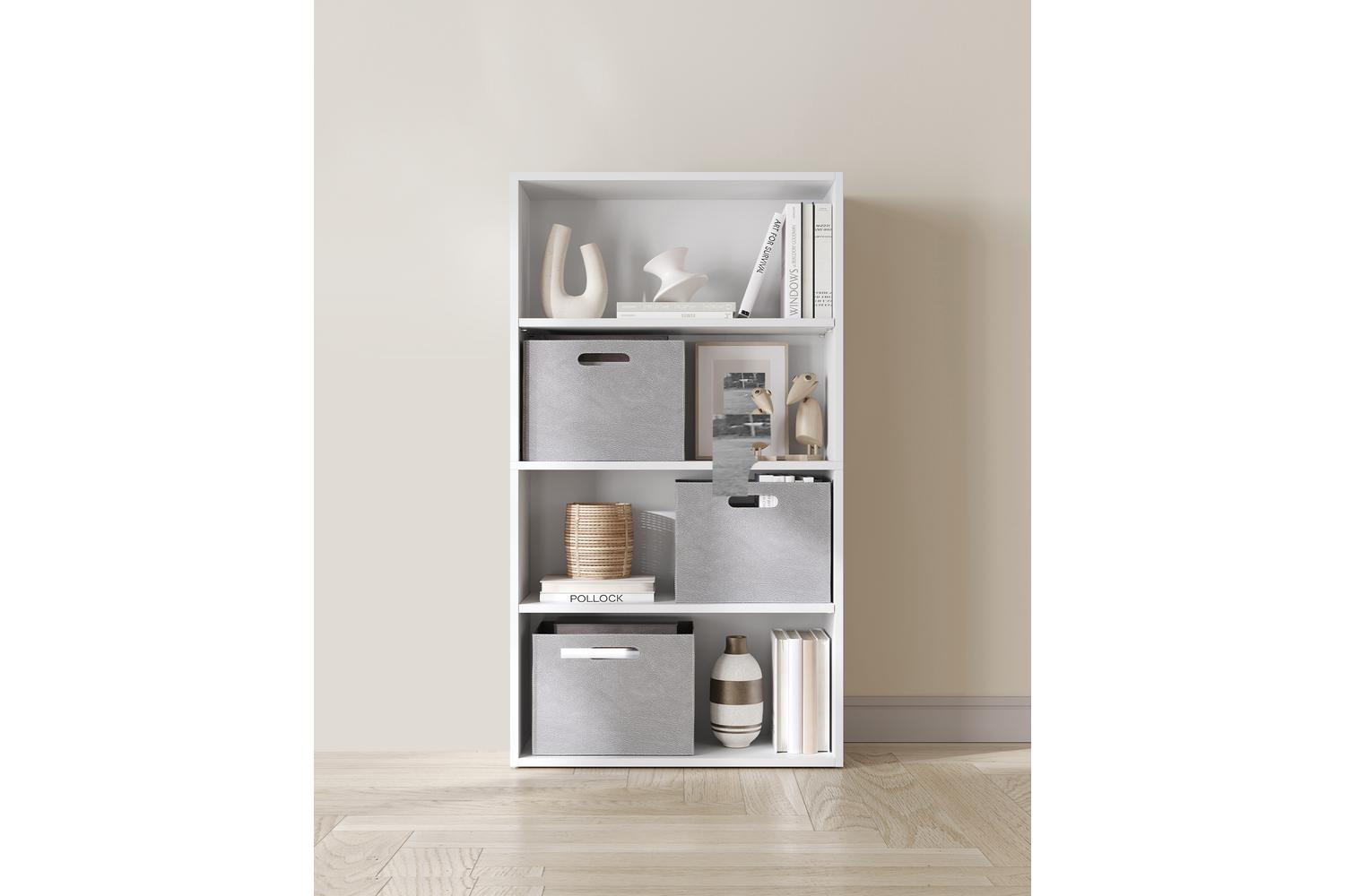 Note: For safety, always secure the bookcase to the wall using the provided anti-tip device. To keep your bookcase looking its best, simply wipe with a damp cloth. Storage boxes are not included.