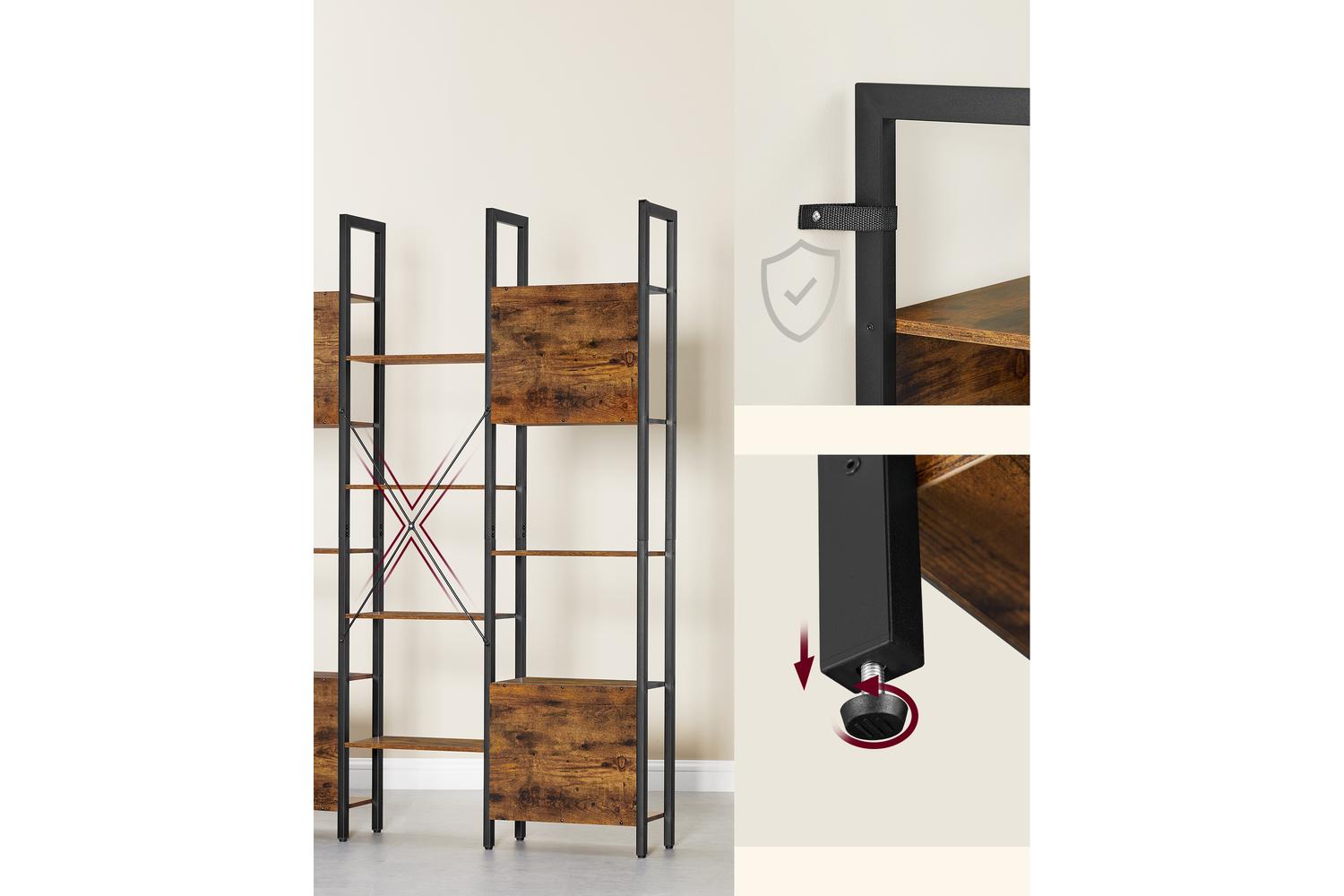 Durability and safety are at the heart of this bookcase. Reinforced with X-shaped braces and a sturdy steel frame, it can support up to 112 kg in total, with each shelf holding up to 8 kg. The back panels prevent your items from slipping off, while the adjustable feet ensure stability on uneven floors. For added peace of mind, the included anti-tip device allows you to securely attach the bookshelf to the wall, making it a safe choice for families and busy households.