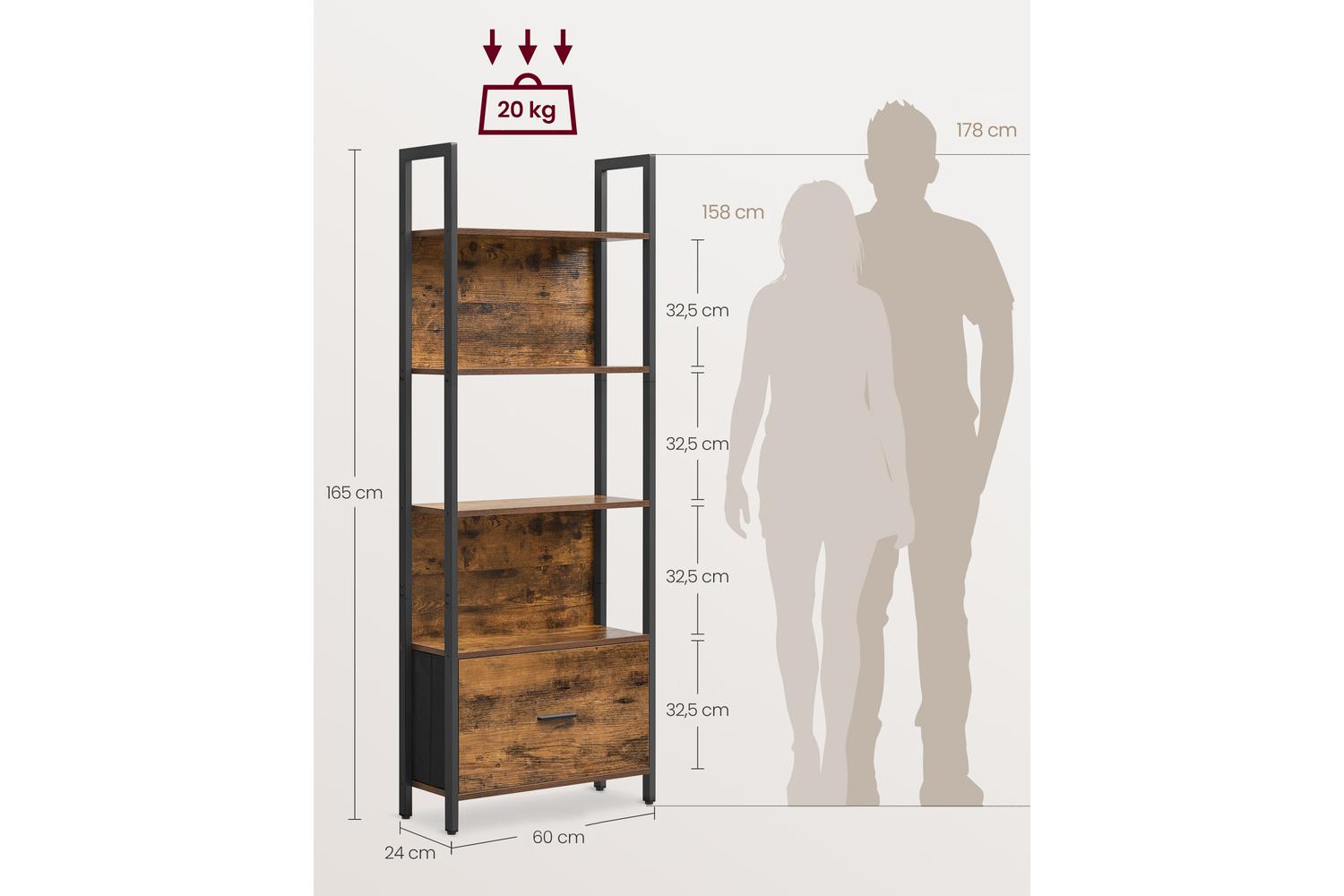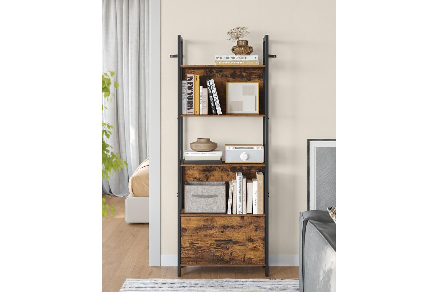 Maximise your living space with this tall, slim shelving unit, ideal for apartments, family homes, or cosy nooks. The five spacious shelves offer ample room to showcase your personal style, while the handy fabric drawer provides a discreet spot to tuck away odds and ends. Whether you are looking to organise your study, add character to your living room, or create extra storage in the bedroom, this ladder bookcase adapts effortlessly to your needs.