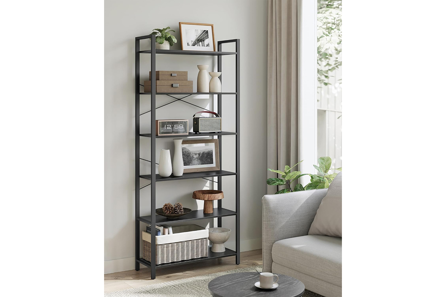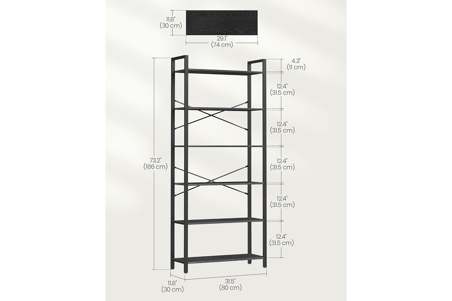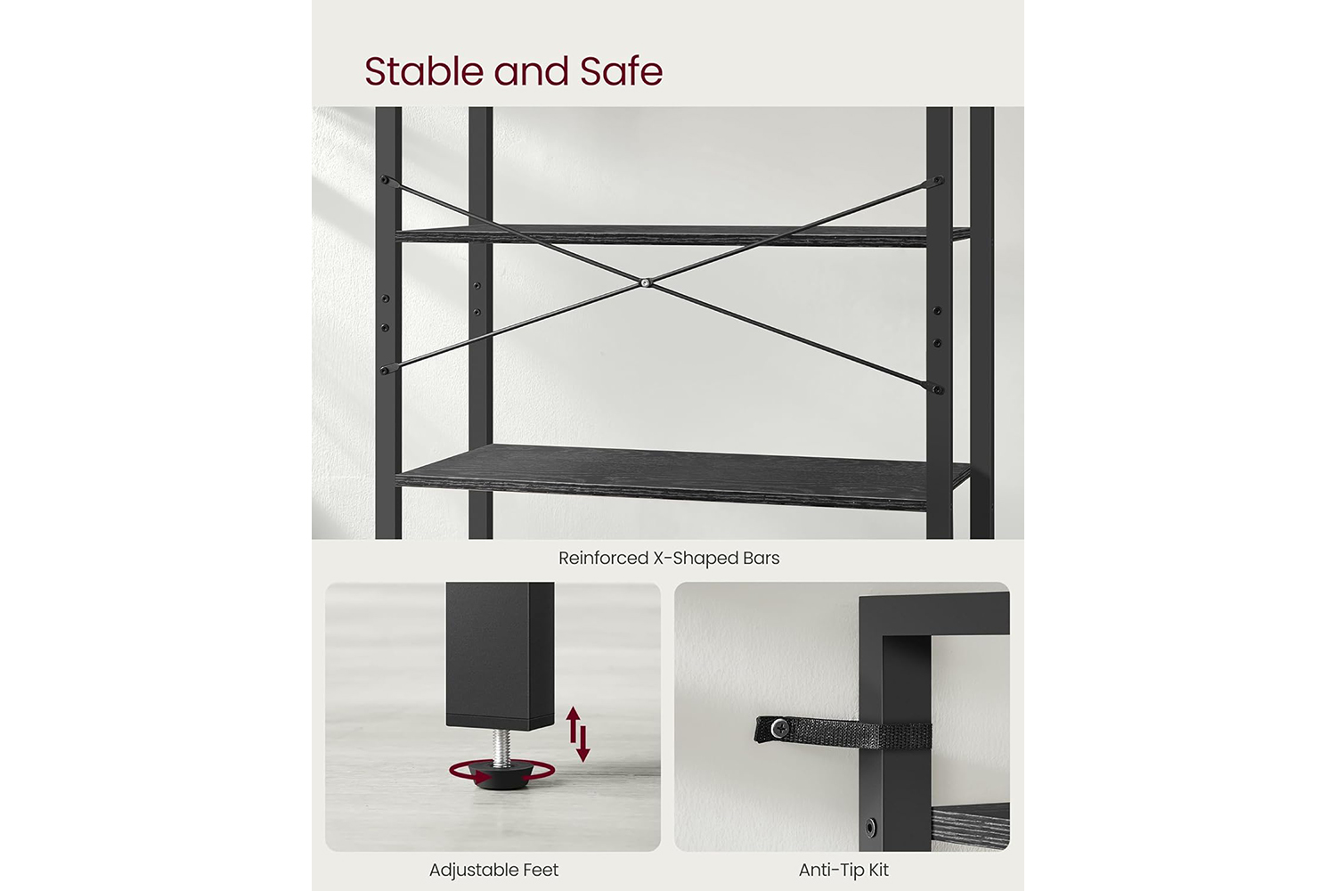 X-shaped bars reinforce the structure, adjustable feet keep this 6-tier book shelf balanced on slightly uneven floors, and the included anti-tip kit will help you fix it to the wall for greater stability and safety.
