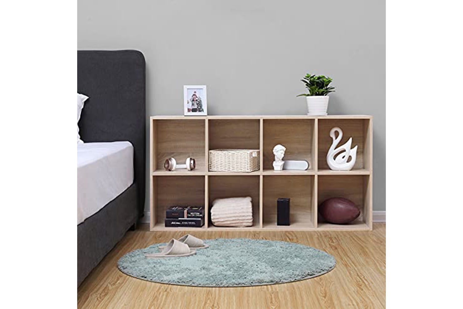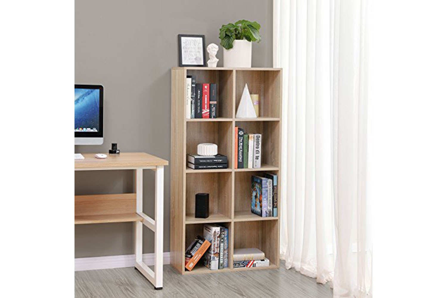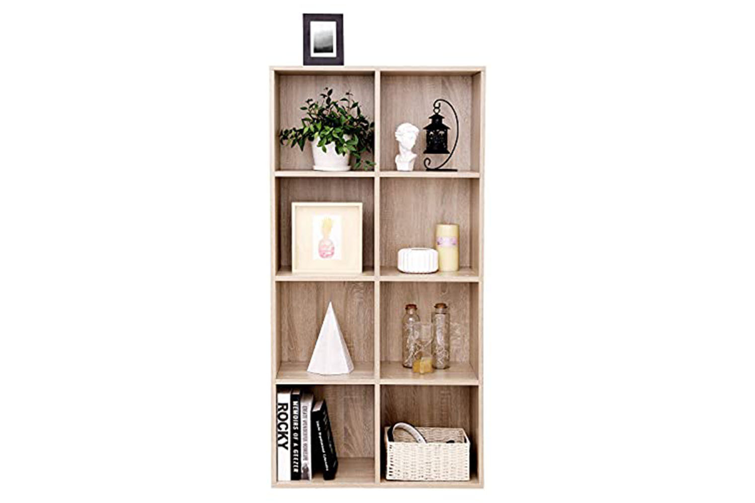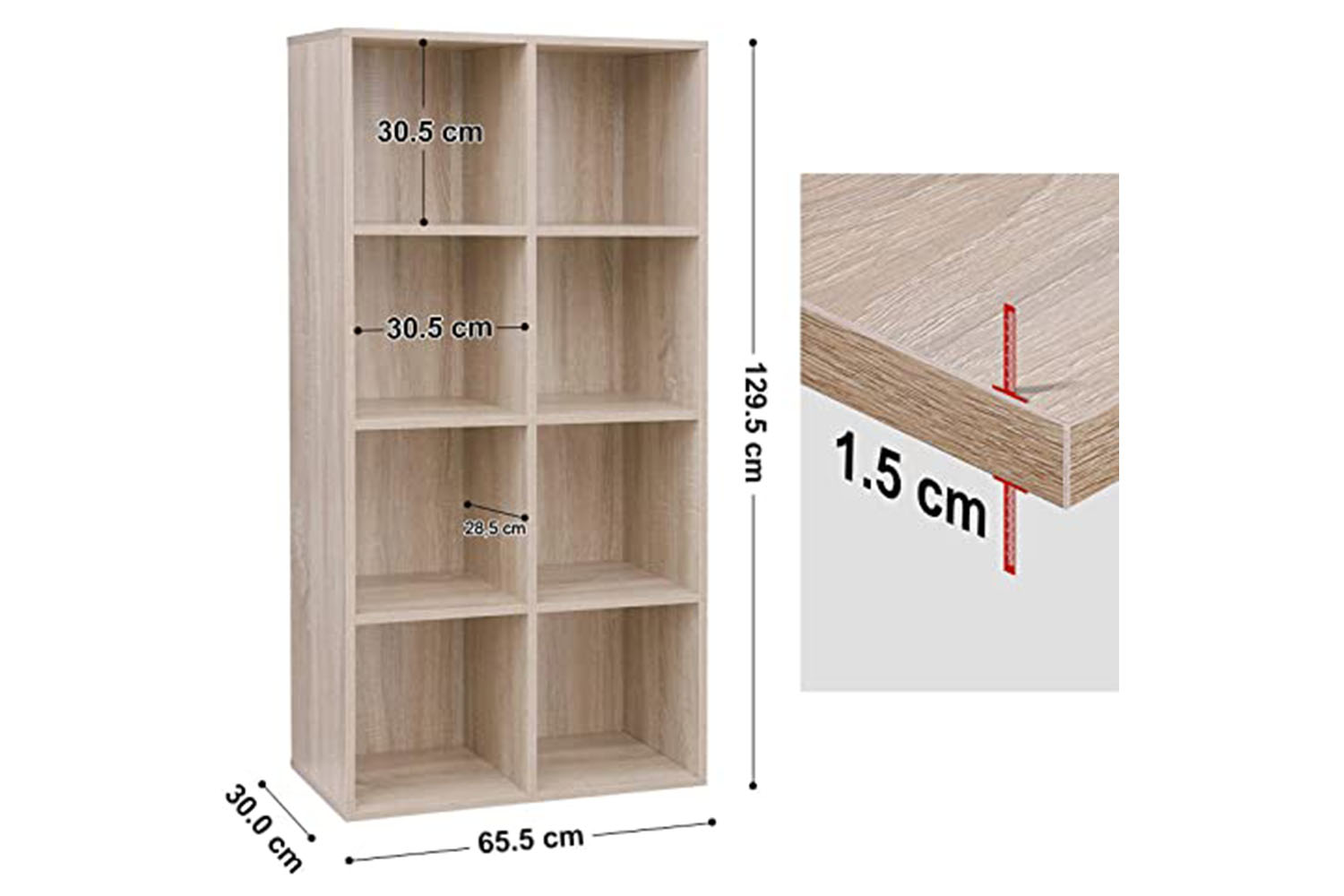 Don't sacrifice style when adding storage to your home; modern bookcase in oak finish (65.5 x 30 x 129.5 cm) offers 8 open storage cubes for your book collections and vinyls within 25.4 cm (10").