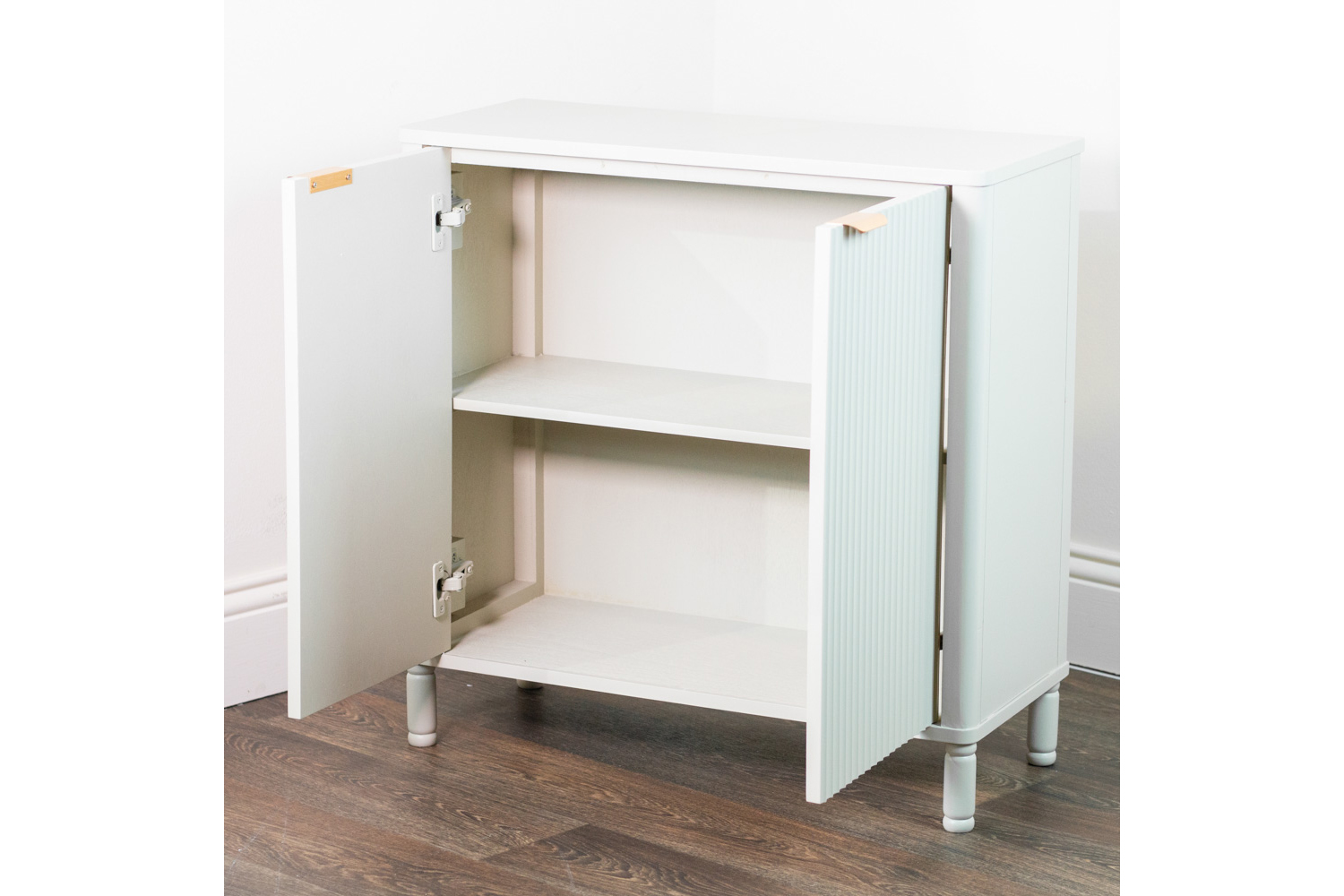 - Includes two spacious cupboards with shelving
