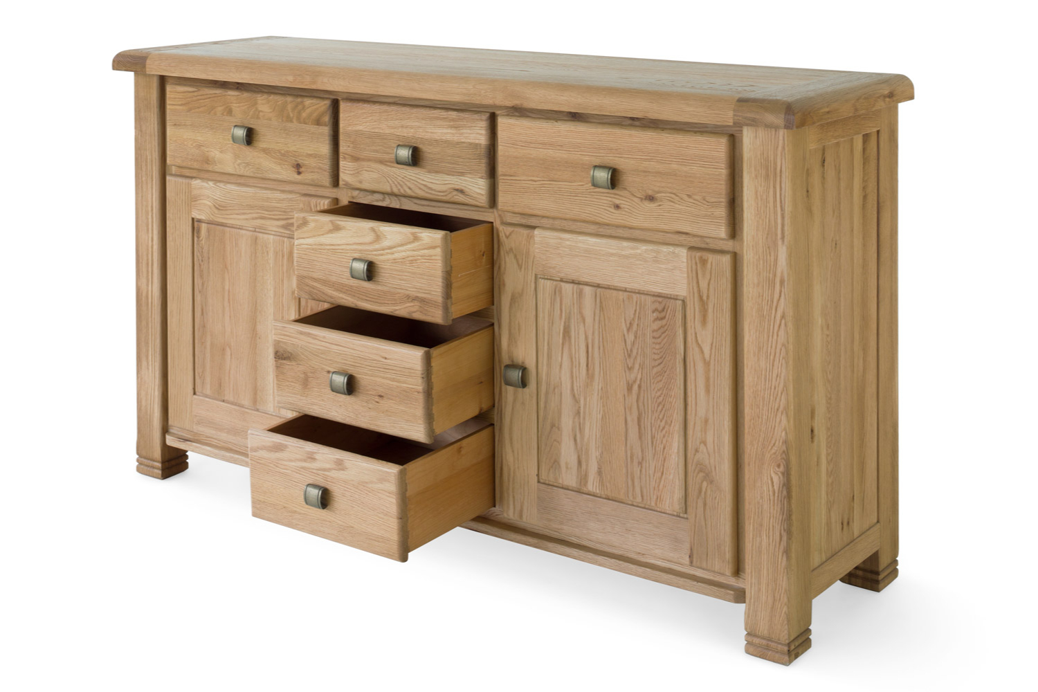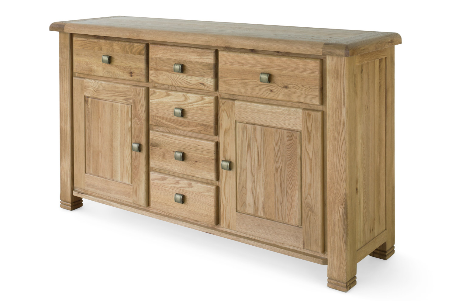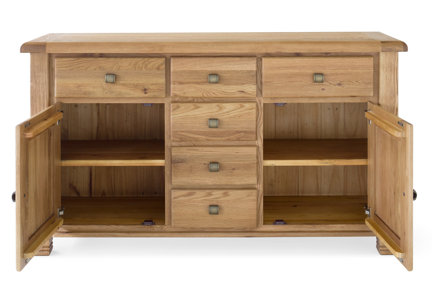 Crafted from oak wood with a natural finish, the Savannah sideboard radiates a warmth and comfort that only wood designs provide. The stepped detailing on the legs and neutral hue gives this sideboard a rich finish. This exquisite piece is the ideal addition to any dining room. It provides ample space on top for prepping or decorative pieces, while the six drawers and two cupboards keep all your dining essentials in an easy to reach place.