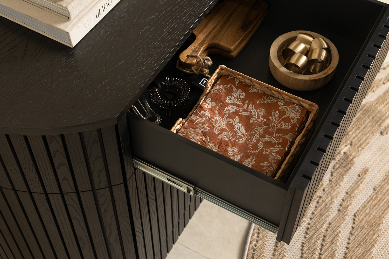 Inside, you’ll discover discreet storage compartments, hidden drawers, and a designated space for your table’s extension panels. Built from premium-quality wood, this sideboard offers durability for everyday use while maintaining an elegant, minimalist design.