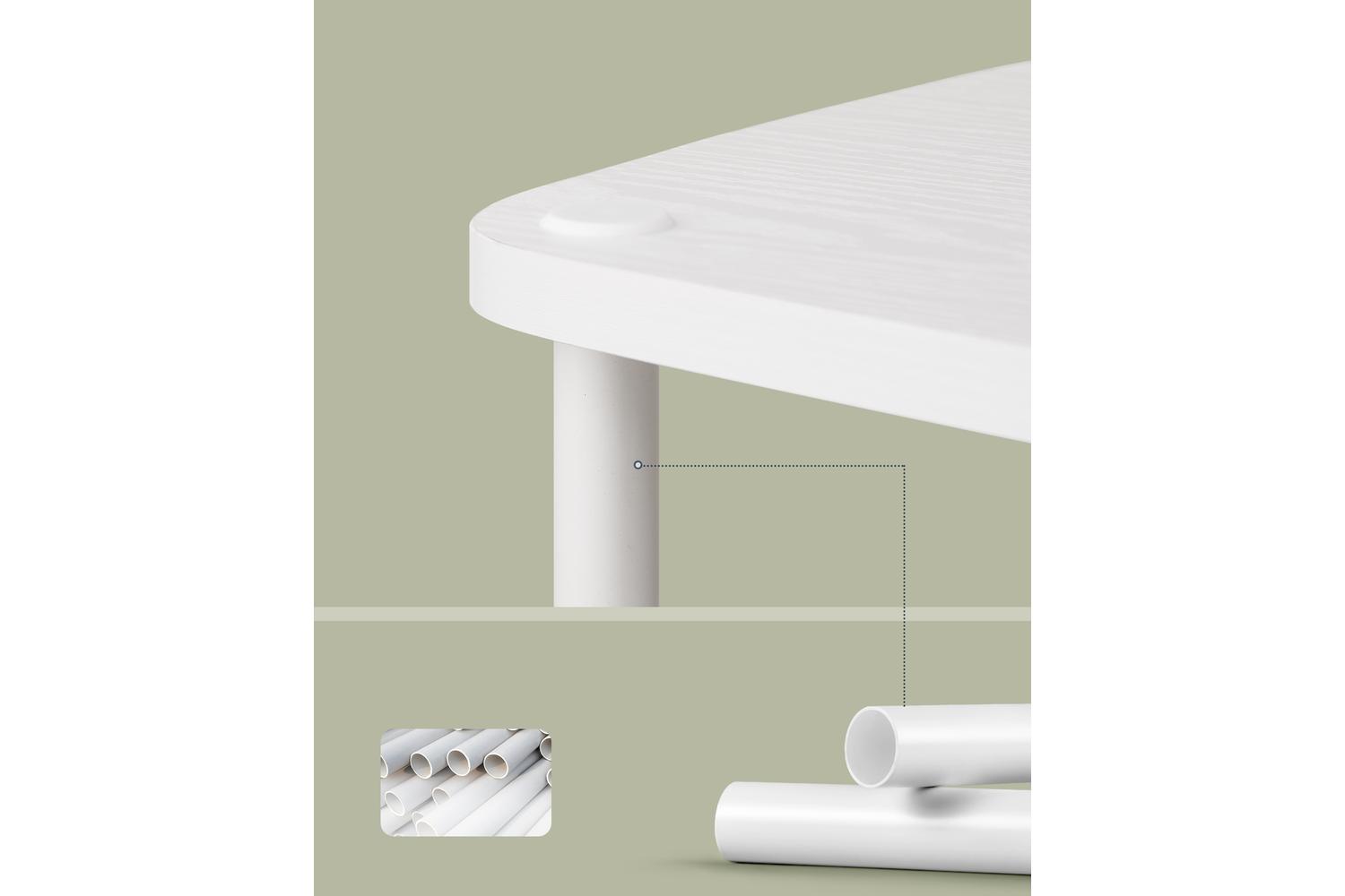 - Modern white finish with clean lines and rounded corners