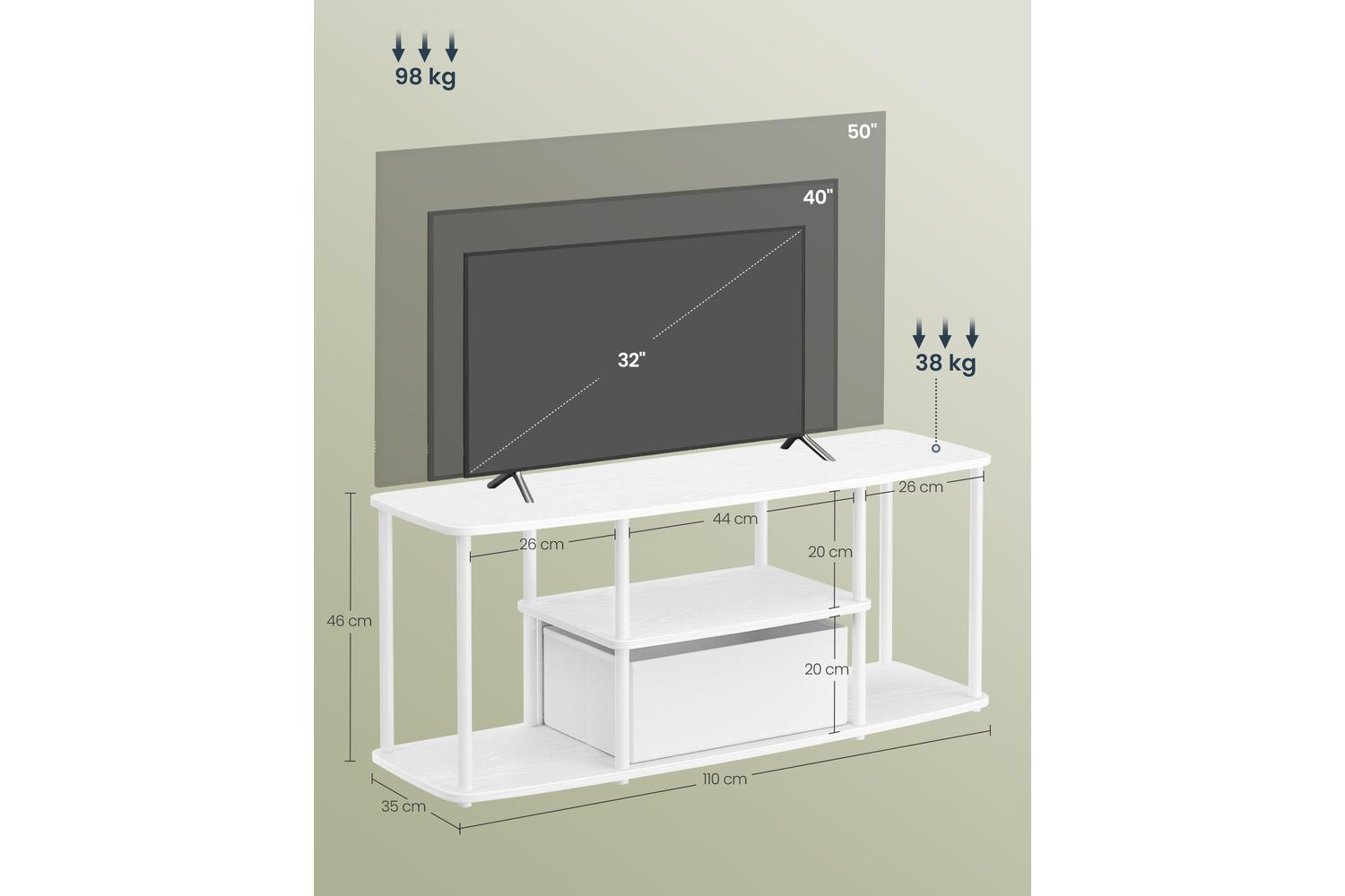 With three spacious levels, this TV cabinet offers ample room for your television, speakers, remote controls, and decorative items. The removable fabric drawer is perfect for keeping books, CDs, and other small essentials neatly tucked away, helping you maintain a clutter-free environment. Its compact size (110 x 35 x 46 cm) makes it a smart choice for smaller spaces, while still providing generous storage and display options.