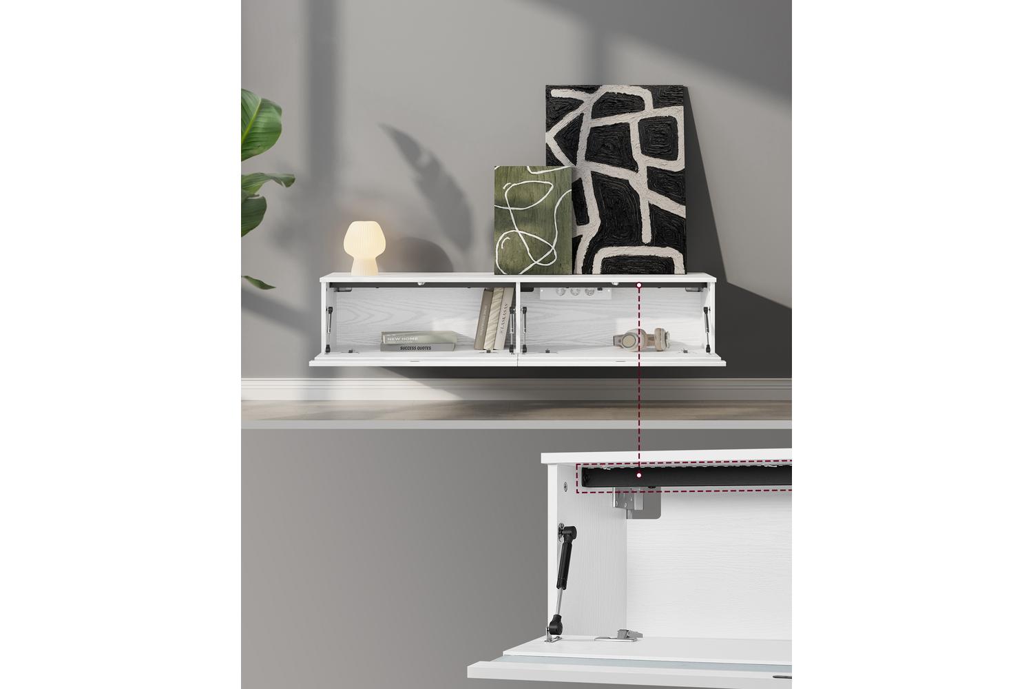 Storage is made simple with two spacious compartments, ideal for keeping books, CDs, and accessories neatly arranged. The upper shelf provides a stylish platform for table lamps, decorative pieces, or family photos, ensuring everything has its place. This floating tv unit is not just a piece of furniture—it is a smart storage solution that enhances your living space and keeps it looking tidy.