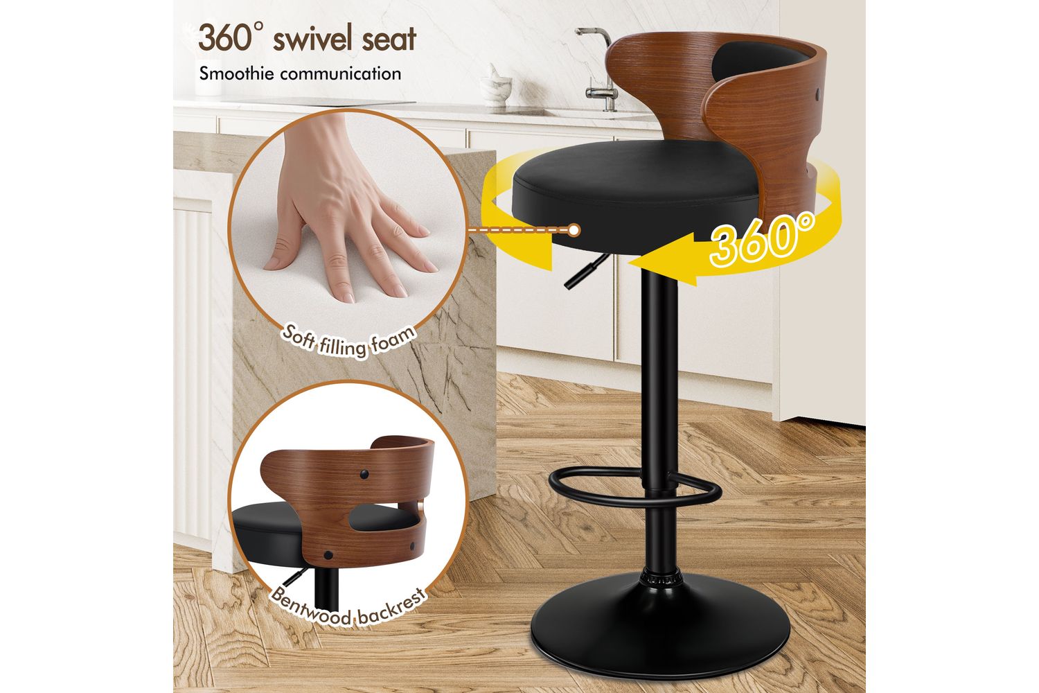 Not only with its iconic design and timeless appeal, but it is also cozy and practical. Upholstered in premium PU leather, the seat and backrest are richly padded with high-resilience foam and comfortable. Thanks to its high-density foam, they provide adequate support in the right places for a delightful sitting experience. Together with its SGS approved gas lift, you don't need to worry about explosion. It presents a 360-degree swivel and adjustable seat height, which makes your conversations smoothie and easy.