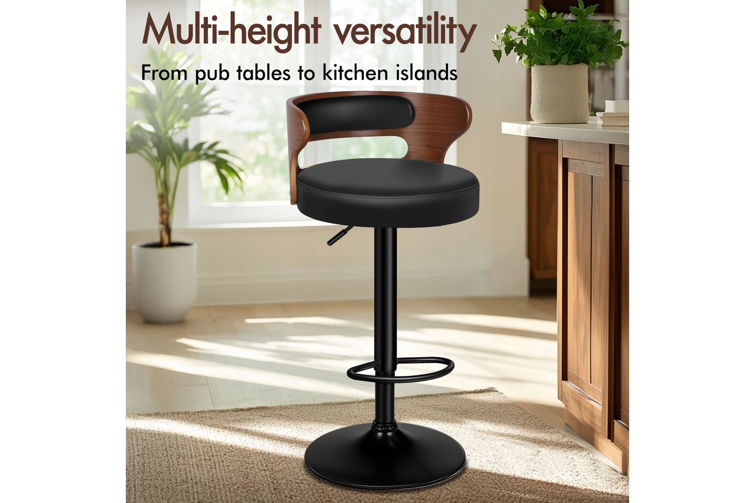 - Finish: Delicate wood grain (seat) and black powder coated chrome (base)