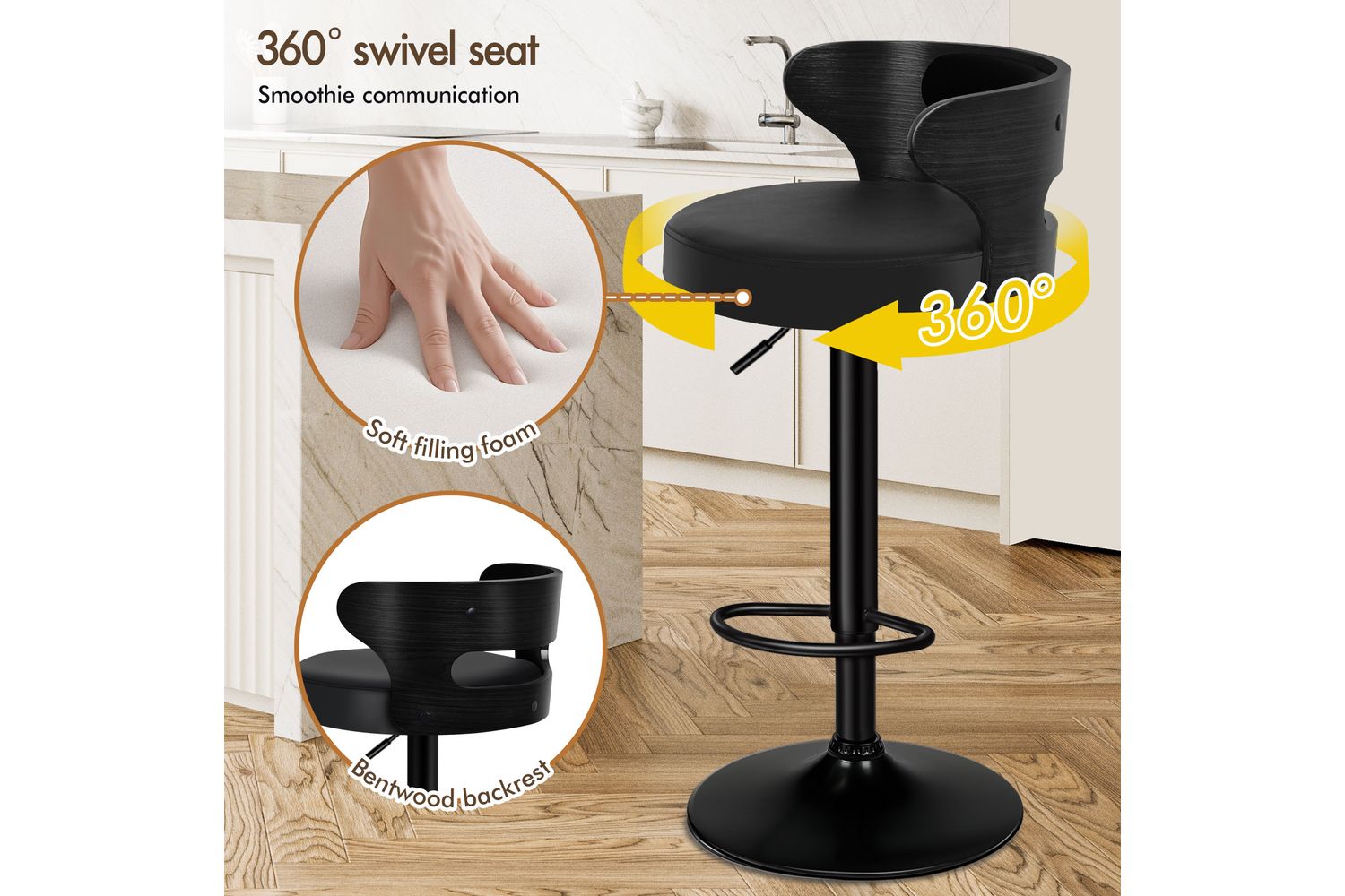 Not only with its iconic design and timeless appeal, but it is also cozy and practical. Upholstered in premium PU leather, the seat and backrest are richly padded with high-resilience foam and comfortable. Thanks to its high-density foam, they provide adequate support in the right places for a delightful sitting experience. Together with its SGS approved gas lift, you don't need to worry about explosion. It presents a 360-degree swivel and adjustable seat height, which makes your conversations smoothie and easy.