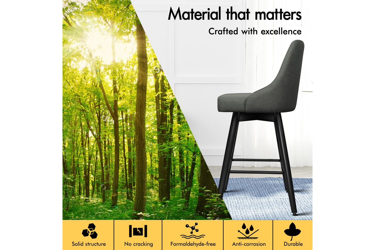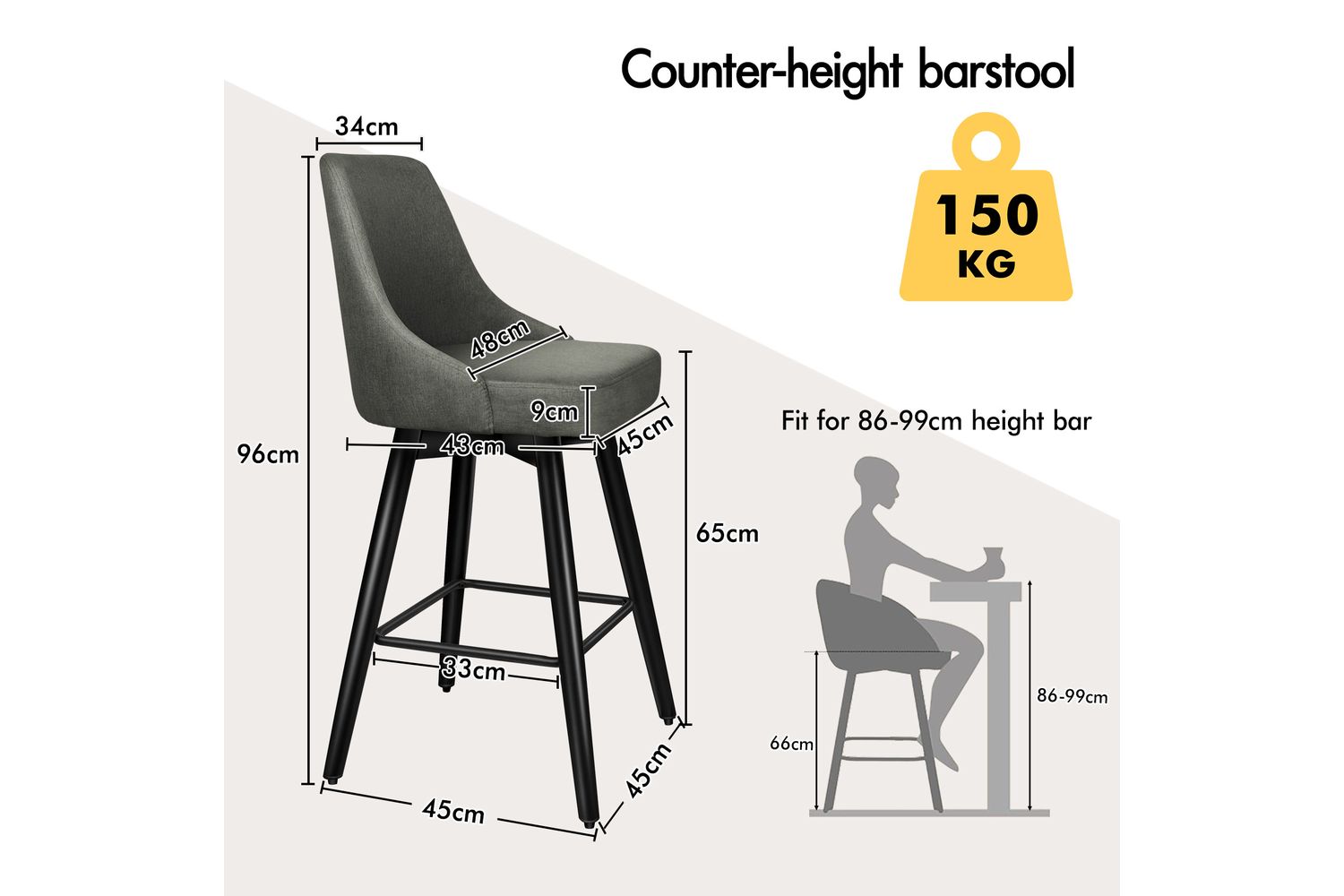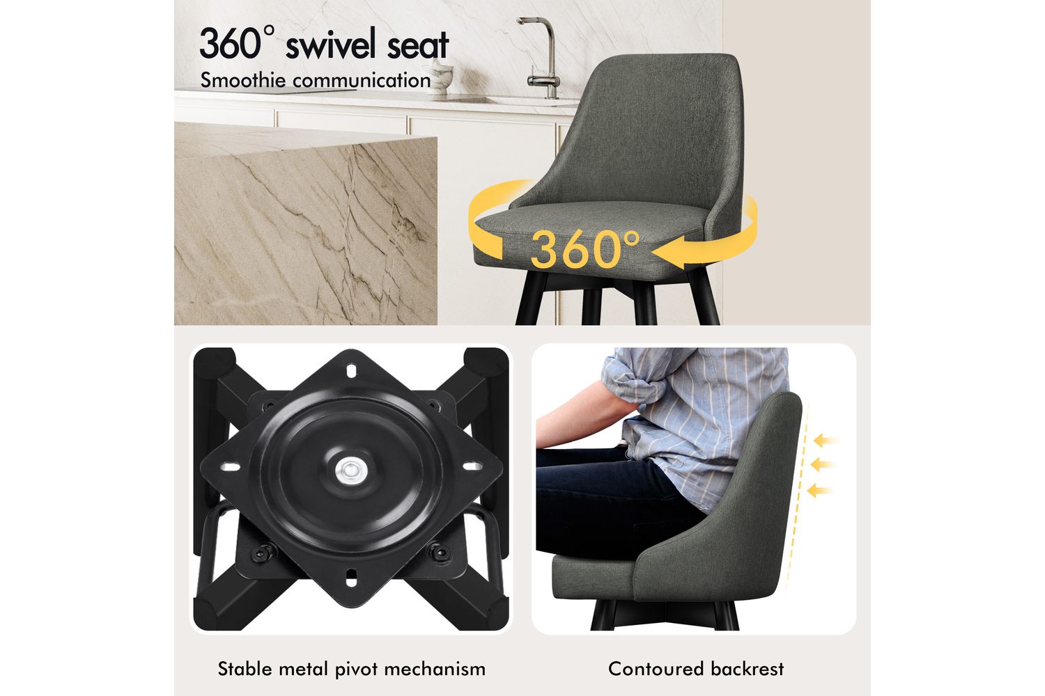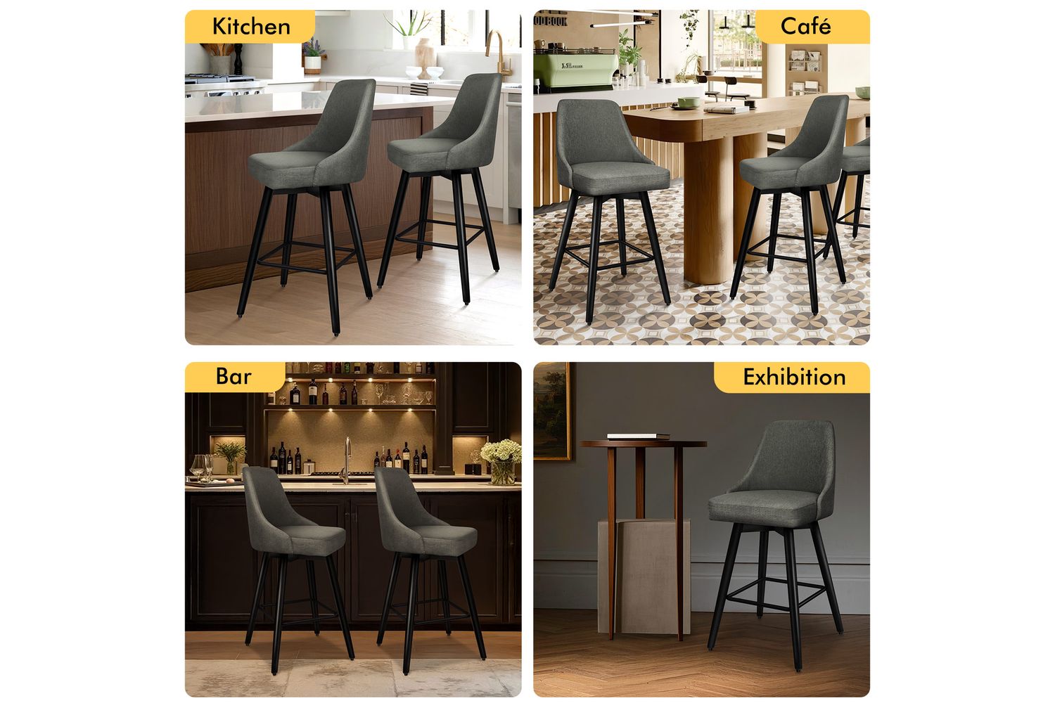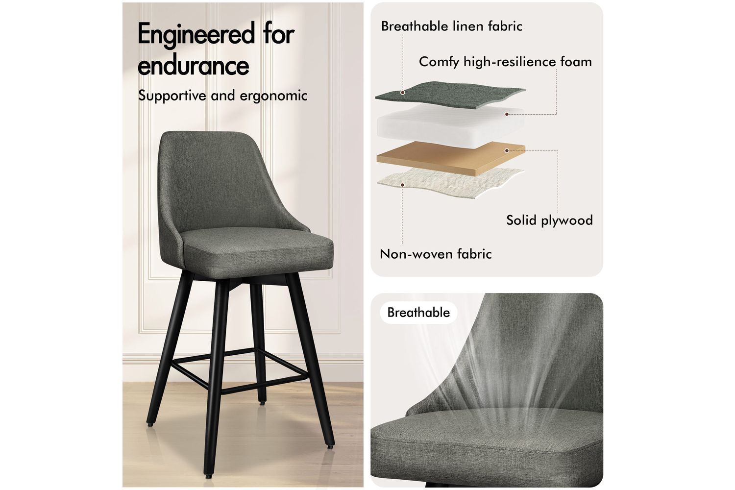 Not only with its iconic design and timeless appeal, it is also cozy and practical. Upholstered in premium linen fabric, the seat and backrest are richly padded with high-resilience foam and comfortable. Thanks to its high-density foam, they provide adequate support in the right places for a delightful sitting experience. Together with its heavy duty and swivel mechanism, this bar stool can be rotated all around for easy facing in any direction, which makes your conversations smoothie.