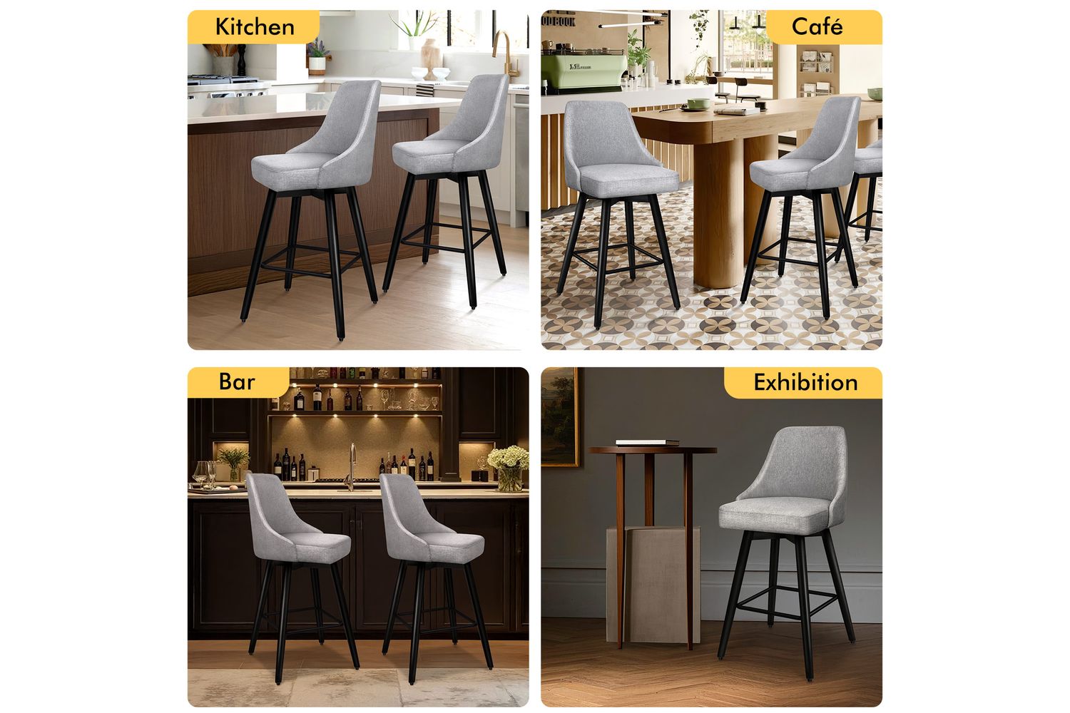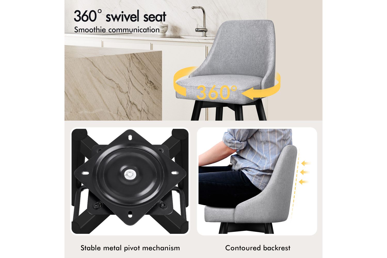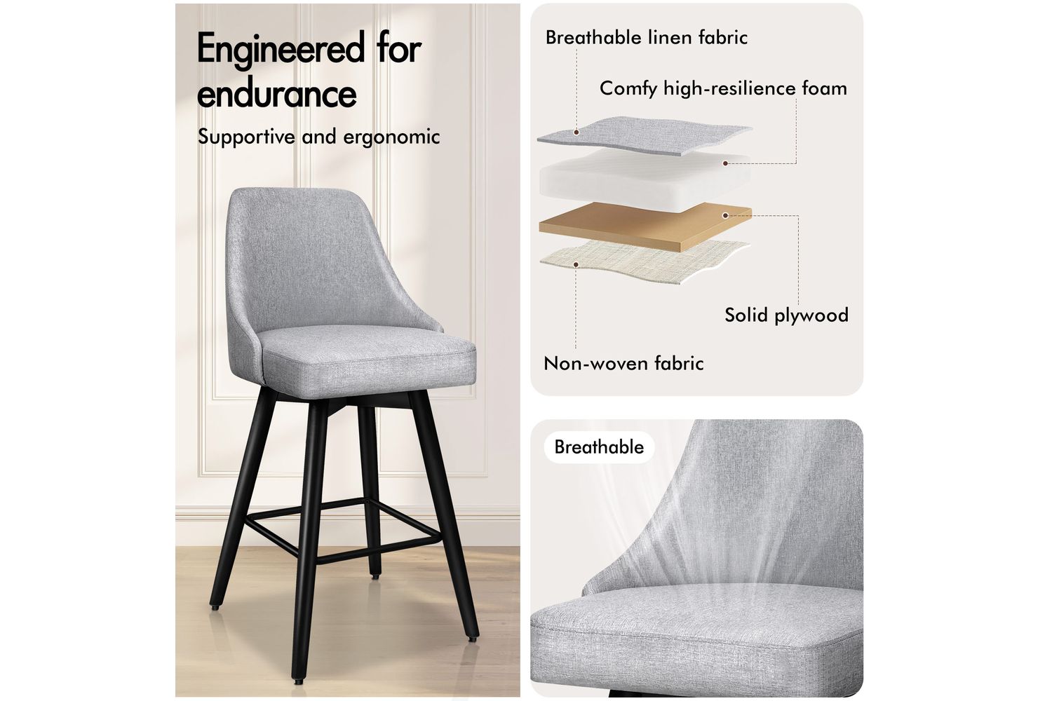 Not only with its iconic design and timeless appeal, it is also cozy and practical. Upholstered in premium linen fabric, the seat and backrest are richly padded with high-resilience foam and comfortable. Thanks to its high-density foam, they provide adequate support in the right places for a delightful sitting experience. Together with its heavy duty and swivel mechanism, this bar stool can be rotated all around for easy facing in any direction, which makes your conversations smoothie.
