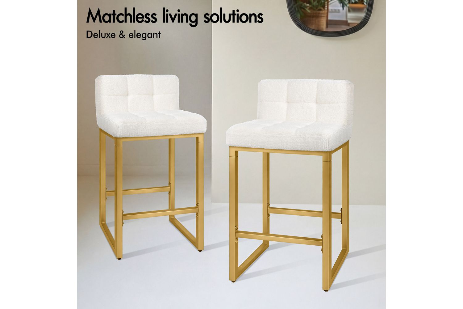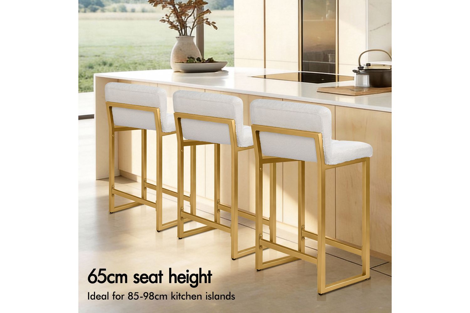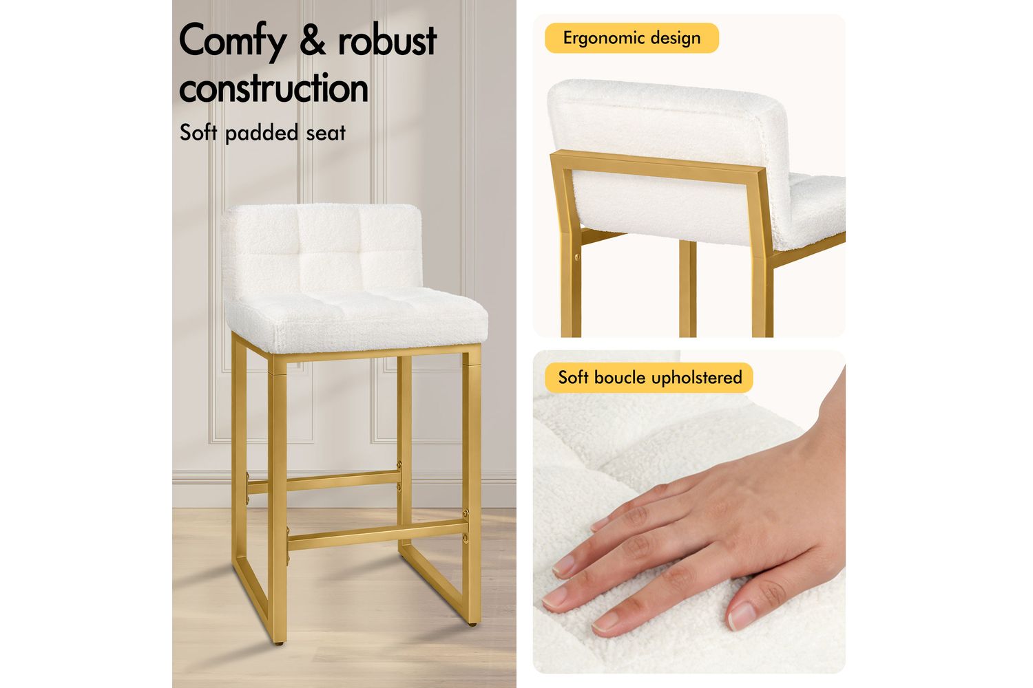 Alfordson Bar Stools Set Of 2 | Boucle Upholstered | Golden Metal Frame | 65CM Counter Height