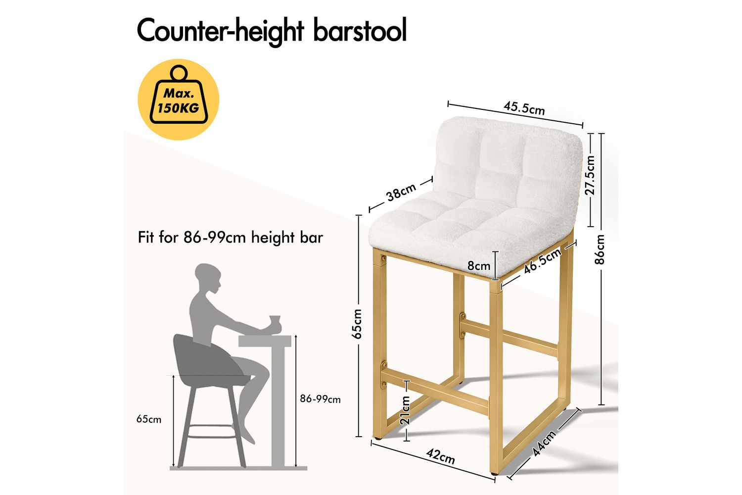 Engineered for comfort, each stool is generously padded with high-resilience foam, offering excellent support exactly where you need it. The built-in footrest allows you to rest your feet and maintain an optimal sitting posture, making these stools ideal for daily use. With a seat height of 65cm, they are perfectly suited for counters and tables with around 90cm knee clearance, giving you plenty of legroom and eliminating awkward bumps or cramped spaces.