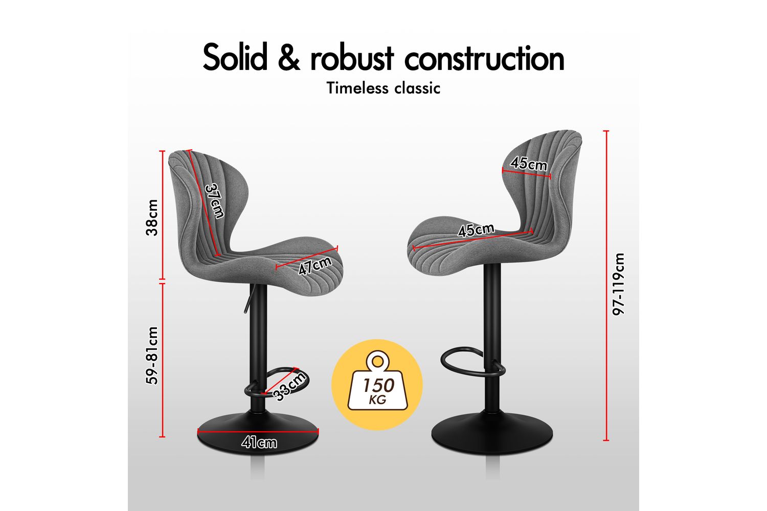 Crafted with a focus on both aesthetics and functionality, the ALFORDSON bar stools boast an ergonomic curved backrest and seat, perfectly contoured to support your body. The premium fabric upholstery in a versatile grey shade complements a wide range of kitchen and dining room decors, while the generous high-resilience foam padding ensures lasting comfort for extended seating. The smoothly rotating 360-degree swivel and easy-to-use gas lift lever allow you to adjust the height to suit your counter or bar, making these stools ideal for any setting.